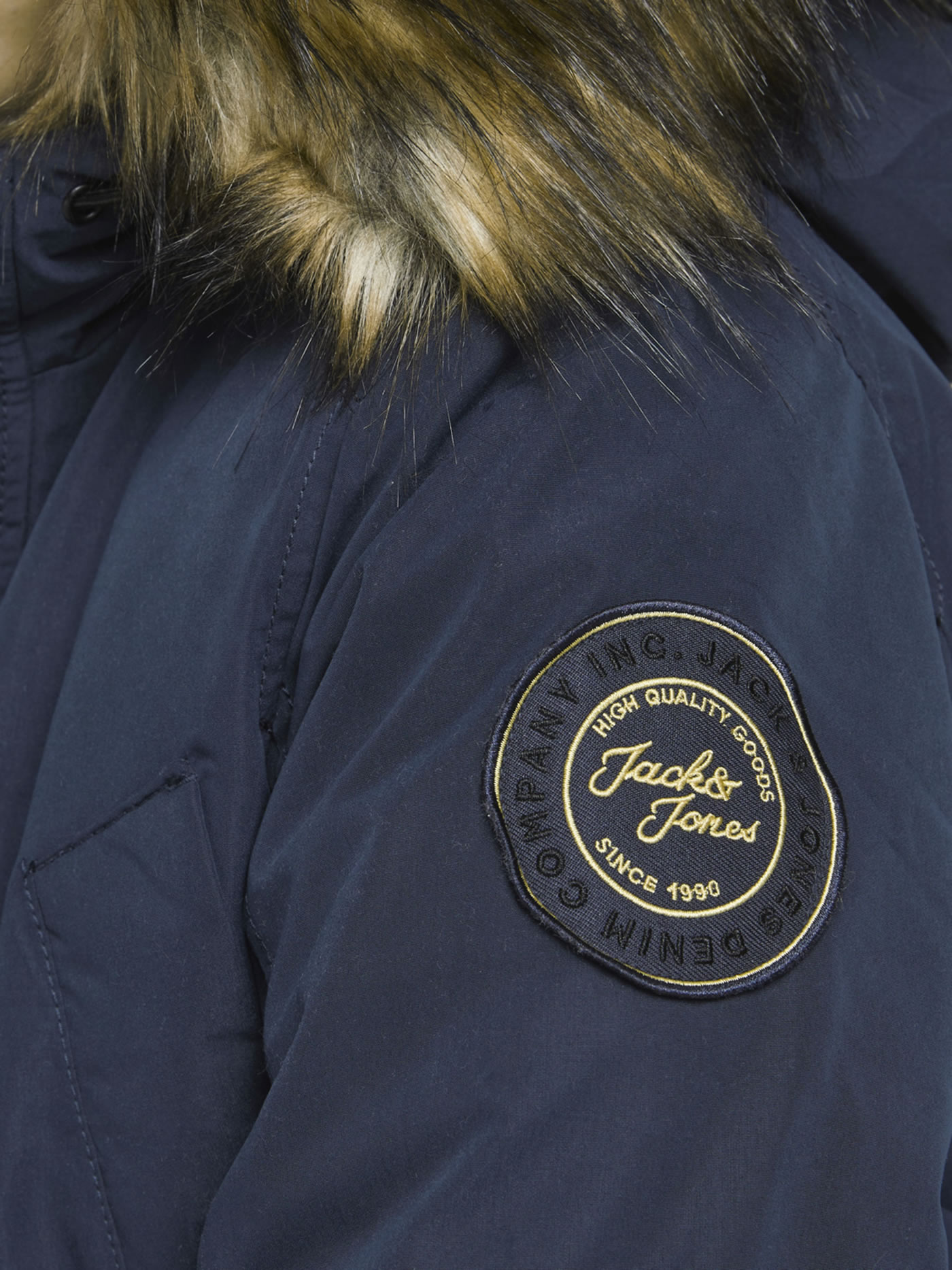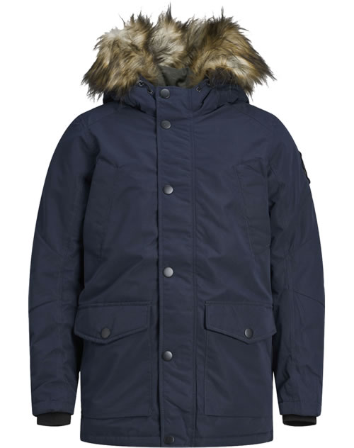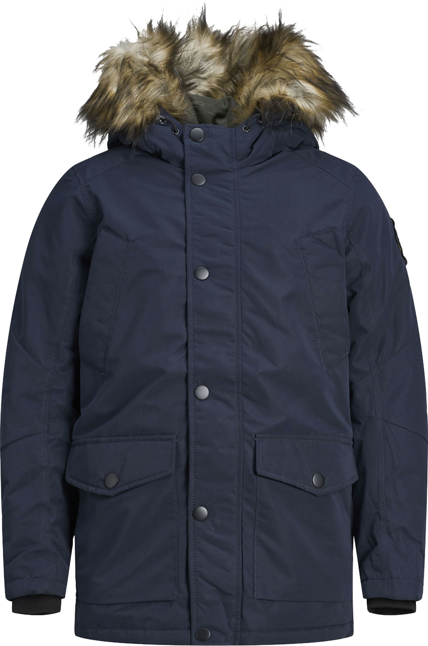 Robuste, Winter-Jacke mit Kapuze von Jack & Jones Junior für Jungen.Das Fell-Imitat an der Kapuze ist abnehmbar. Auf der Vorderseite befinden sich zwei aufgesetzte Klapptaschen und zwei Brusttasche mit Druckknöpfe. Die Jacke läßt sich per Reißverschluss mit unterlegtem Windschutz, damit Wind und Regen nicht nach innen dringen können, schließen. Zusätzlich bieten Druckknöpfe Schutz. Sie ist wind-und schmutzabweisend. Verlängerte Bündchen in den Ärmeln sorgen für einen guten Sitz. Die Kapuze ist mit kuscheligem Fleece gefüttert. Eine Innentasche bietet Platz für Geldbörse etc. Das Jack & Jones Label am Ärmel ist ein weiteres hübsches Detail. Ein warmes Innenfutter schützt vor Kälte. Durch ihre Waschbeständigkeit hat die Jacke eine lange Lebensdauer.
