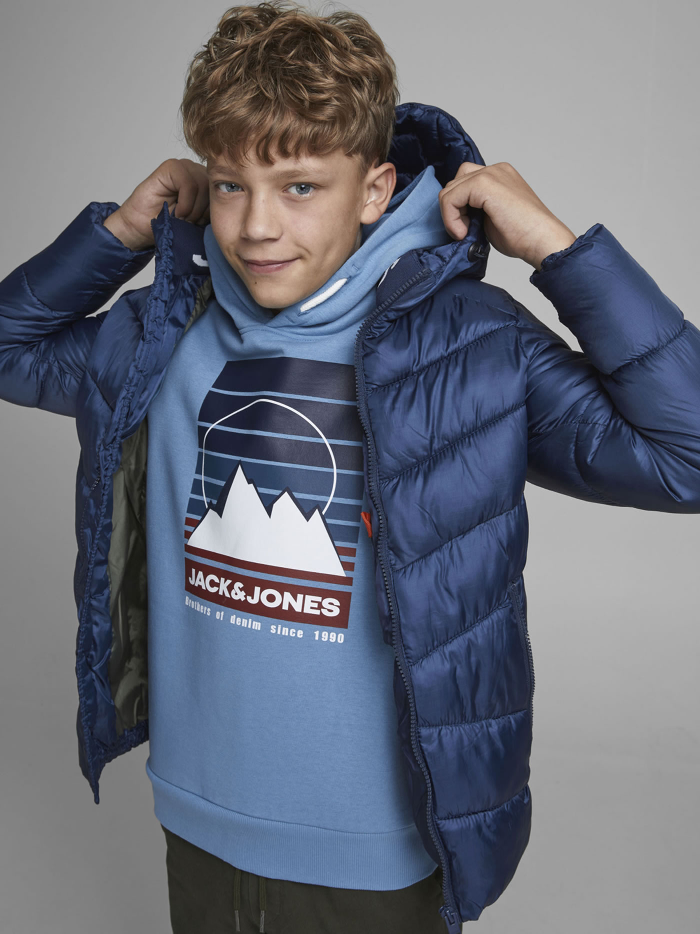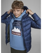 Tolle Jacke mit Kapuze von JACK & JONES JUNIOR für Jungen. Die gesteppte Jacke in blau hat zwei vorn Reißverschlusstaschen und eine Innentasche mit Platz für Kleinigkeiten. Die Jacke ist ein toller Begleiter für kühlere Tage.