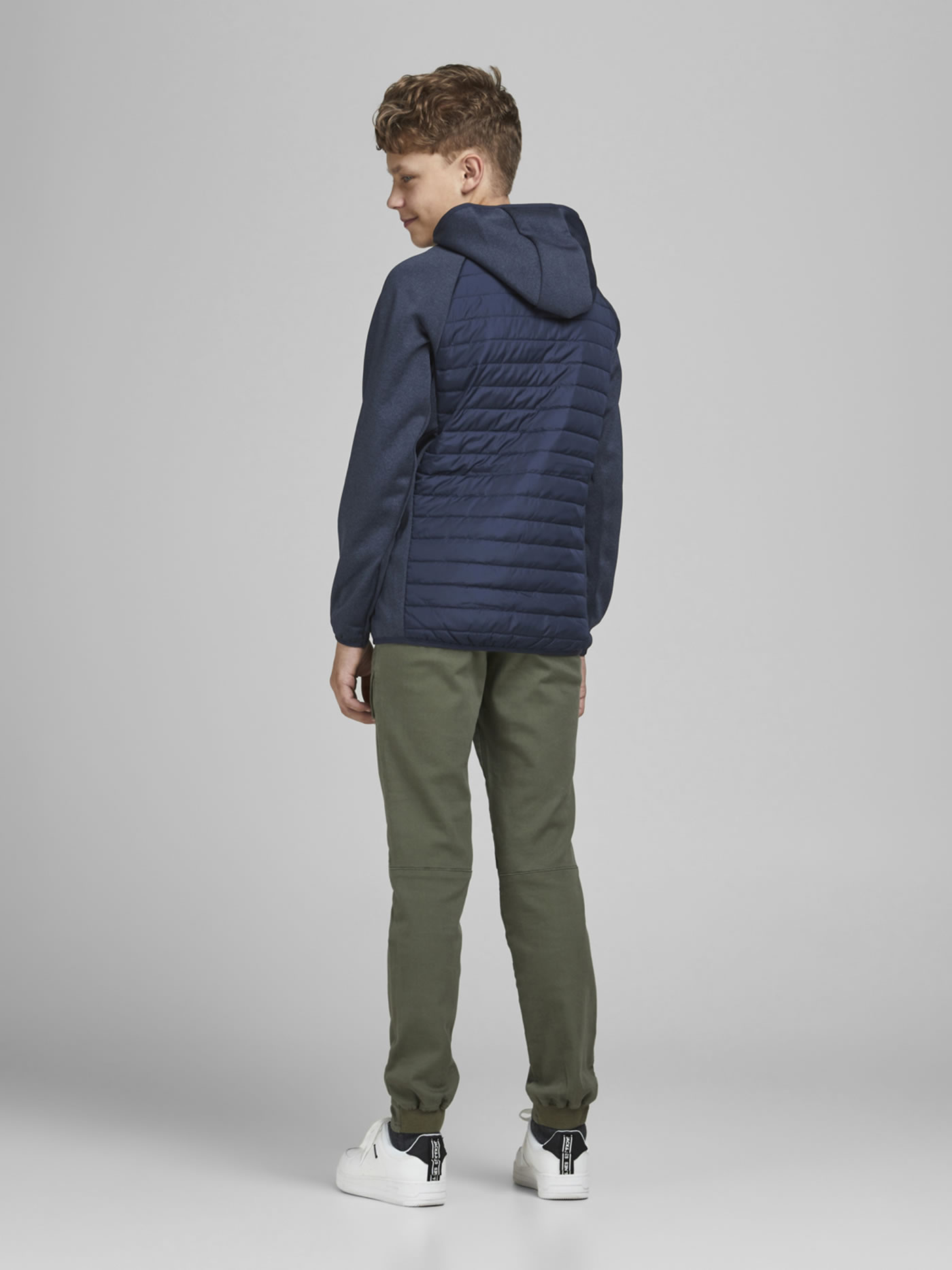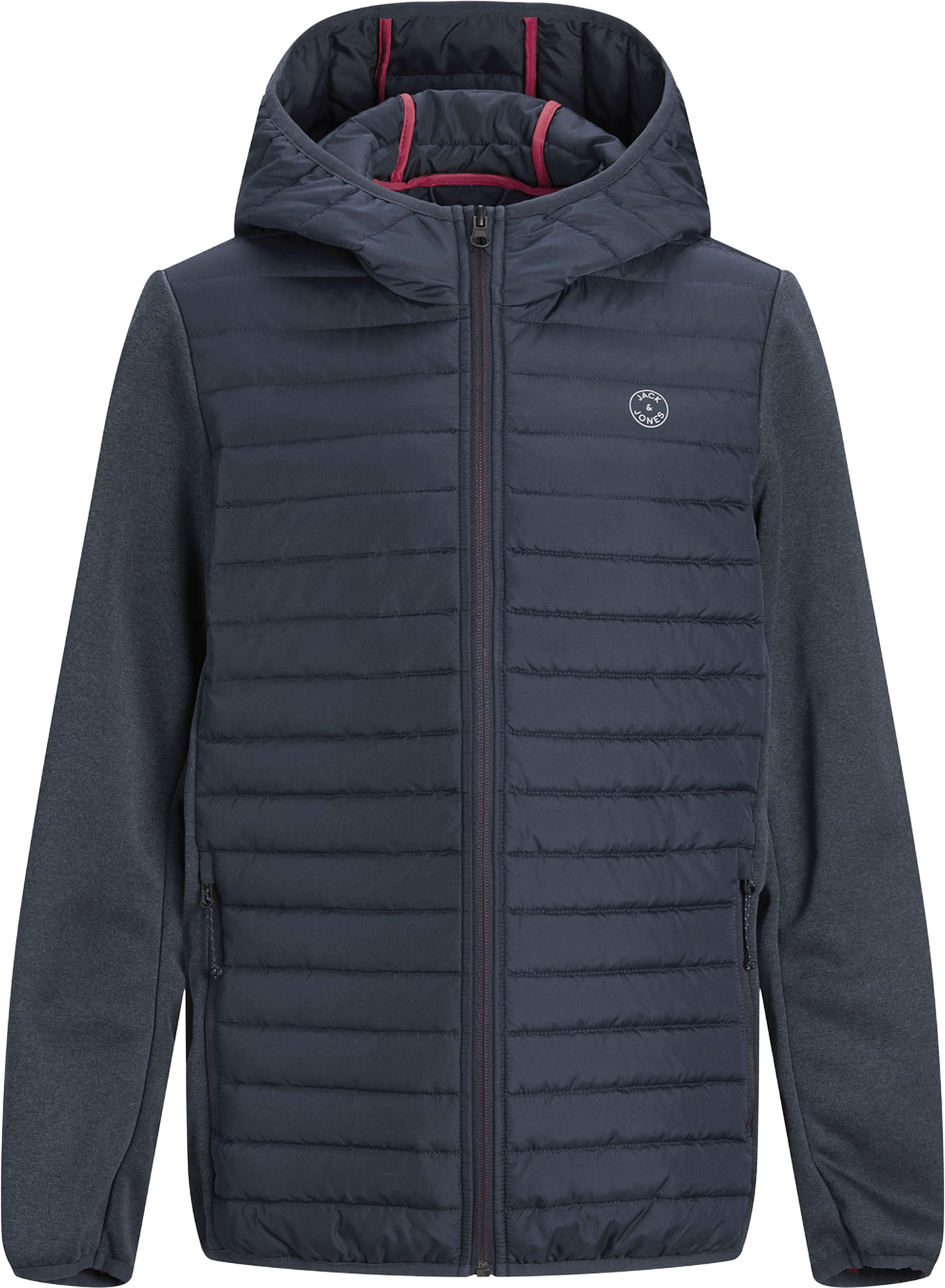 Leichte Stepp-Jacke mit Kapuze von JACK & JONES JUNIOR für Jungen. Die Jacke ist ideal für die Übergangszeit und schützt an windigen und kühleren Tagen. Die Ärmel und die Seiten sind aus Softshell-Material und mit Fleece gefüttert. Zwei Einstecktaschen bieten Platz für Kleinigkeiten.
