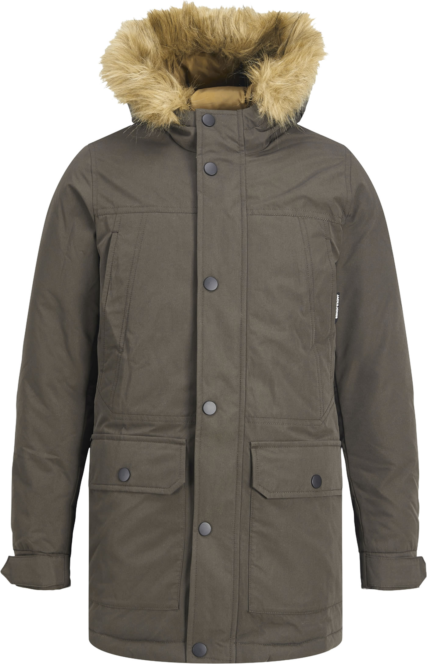 Robuste Winter-Jacke mit Kapuze von Jack & Jones Junior für Jungen. Das Fell-Imitat an der Kapuze ist abnehmbar. Auf der Vorderseite befinden sich zwei aufgesetzte Klapptaschen und zwei Brusttaschen. Die Jacke läßt sich per Reißverschluss und einer zusätzlichen Druckknopfleiste verschliessen, so können Wind und Regen nicht nach innen dringen. Die Jacke ist wind-und schmutzabweisend. Die Bündchenweite an den Ärmeln lässt sich regulieren. Eine Innentasche bietet Platz für Geldbörse etc. Das gesteppte Futter ist wattiert. Der Parka ist damit ideal für kalte Tage.