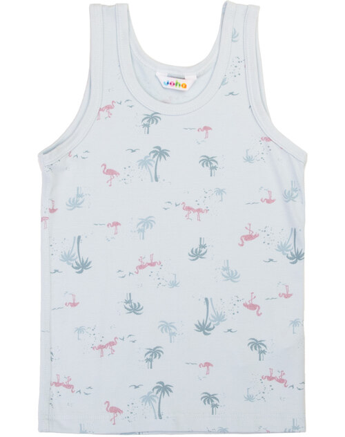 Dieses hübsche Unterhemd für Mädchen aus einer hochwertigen, weichen Materialmischung aus Bambus-Viskose und Lycra begeistert mit einem liebevollen Allover-Print mit Glitzer-Flamingos und Palmen 🦩🌴✨