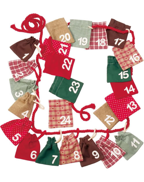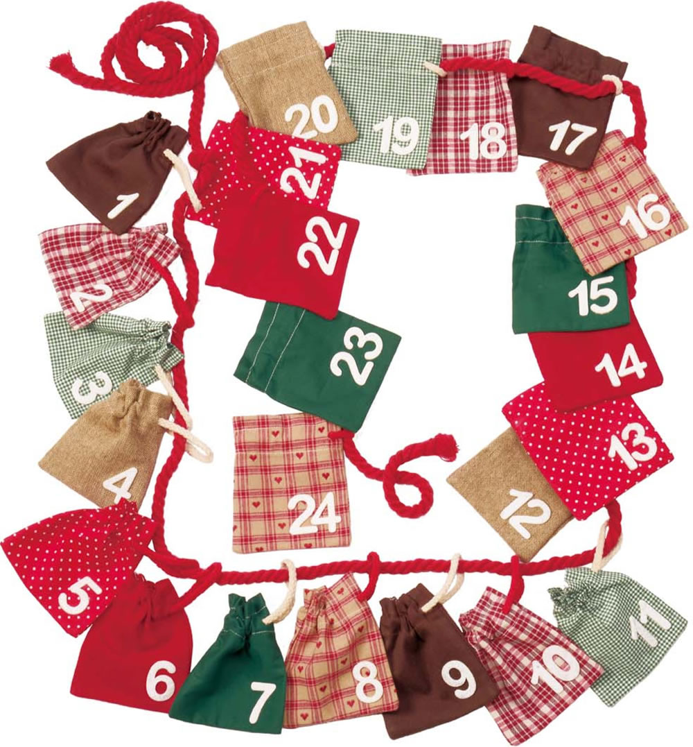 Bunte Säckchen machen diesen Adventskalender zu einem tollen Blickfang in jeder Weihnachtsdekoration. Die 24 Anhänger aus Stoff zeigen klassische Motive. Sie können individuell mit Süßigkeiten oder kleinen Geschenken befüllt werden und verkürzen Kindern und auch Erwachsenen die Wartezeit bis zum großen Fest.