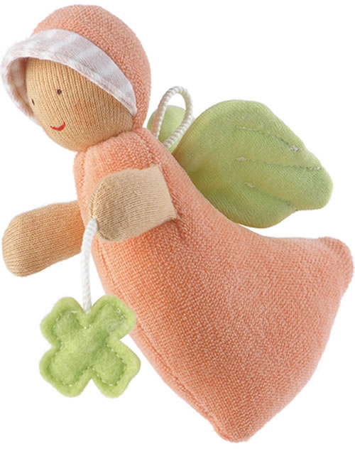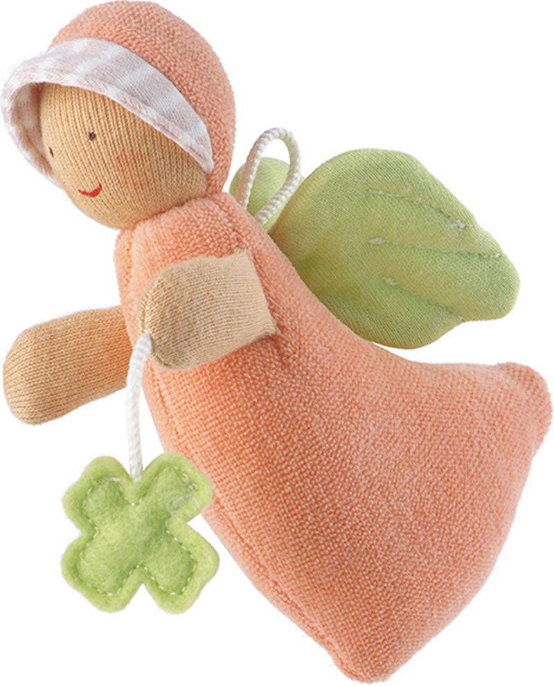 Der Greifling Glücksengel fasziniert immer wieder durch sein Rasseln im Körper. Der Engel ist aus sehr weichem apricotfarbenem Nickistoff. Die verspielte Mütze ziert das von Hand bemalte Gesicht. In grünem Baumwolljersey sind das Glückskleeblatt, das der Engel in seinen Händen trägt, als auch die Engelsflügel.