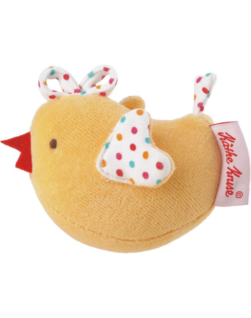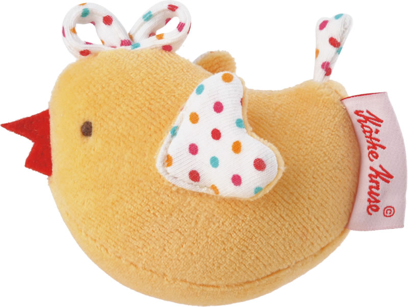 Der Greifling fasziniert immer wieder durch sein Rasseln im Körper. Doddy weckt die Neugier und fördert erste Greif- und Fingerübungen. Der Körper ist aus sehr weichem apricotfarbenem Nickistoff. Die Augen sind von Hand gestickt. Der Schnabel ist aus rotem Filz. Das Kammblatt, die Flügel und der Schwanz sind aus gepunktetem Baumwolljersey.