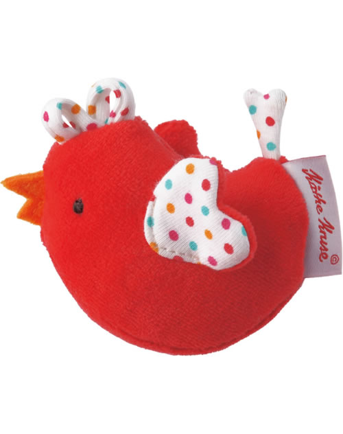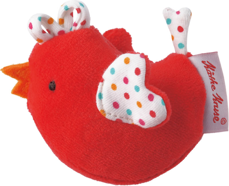 Der Greifling fasziniert immer wieder durch sein Rasseln im Körper. Doddy weckt die Neugier und fördert erste Greif- und Fingerübungen. Der Körper ist aus sehr weichem roten Nickistoff. Die Augen sind von Hand gestickt. Der Schnabel ist aus orangem Filz. Das Kammblatt, die Flügel und der Schwanz sind aus gepunktetem Baumwolljersey.