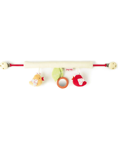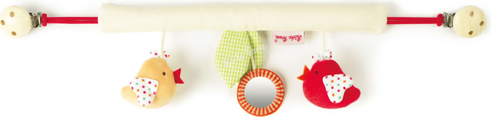 Spielspaß für unterwegs! An der Kinderwagenkette hängt viel Unterhaltungsvergnügen für die Kleinen: