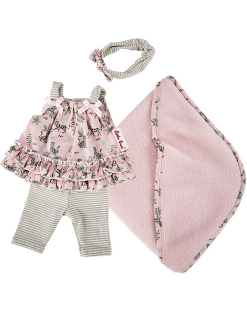 Set bestehend aus einem Strandkleid mit Leopardenaufdruck, einem gestreiften Haarband, gestreiften Leggings und einer weichen Decke.