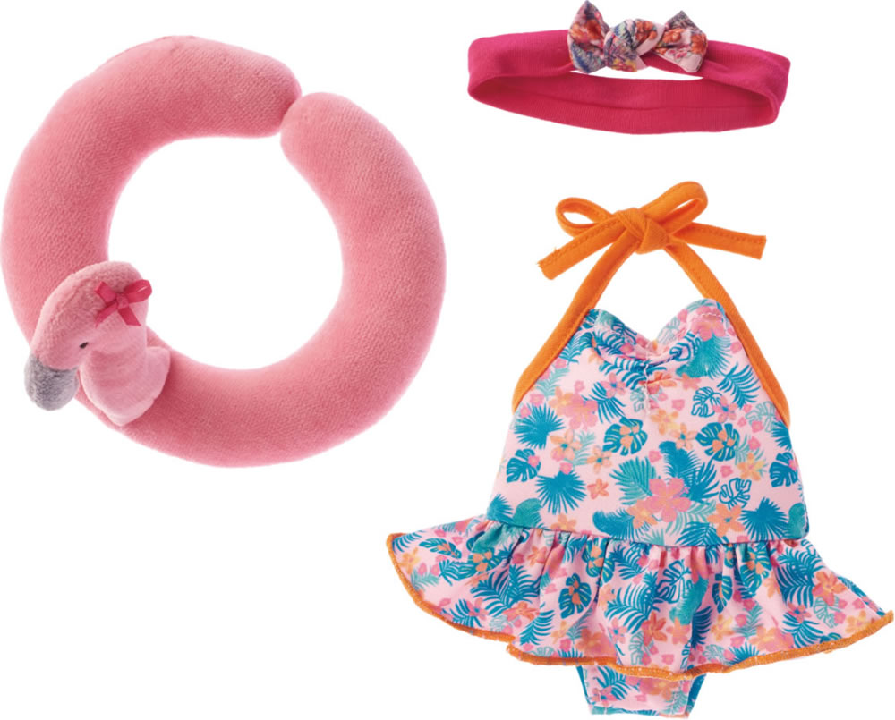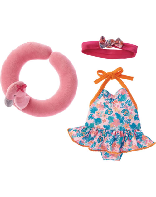 Set bestehend aus einem bedruckten Badeanzug mit orangefarbenen Akzenten und einem Schwimmreifen in Flamingo-Design. Passend für Käthe Kruse Puppen mit der Größe 30-33 cm.