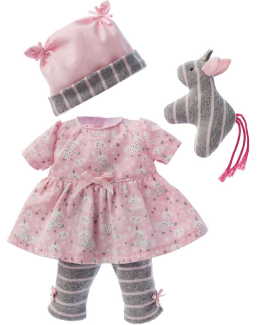 Set bestehend aus einem rosafarbenem Baumwollkleid, bedruckt mit Einhörnern, dazu eine rosa-graue Leggings aus Ringeljersey. Passend für alle Käthe Kruse Puppen mit der Größe von 30-33 cm.
