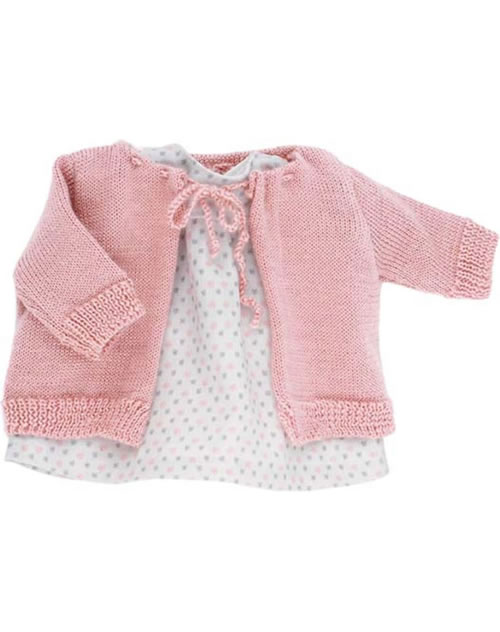 Die Bekleidung besteht aus einem beigefarbenen Kleid mit Sternen und einer rosa Strickjacke.
