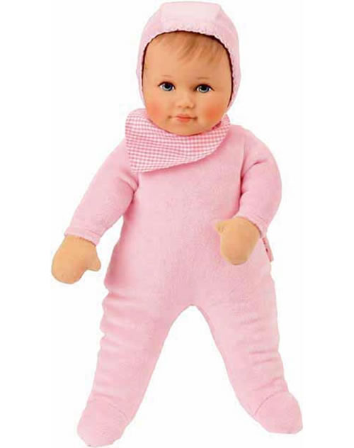 Schmusepuppen begleiten Babys in den ersten Jahren und sind wichtig für die Entwicklung. Sie brauchen sie zum Liebhaben und Kuscheln. Eine besondere ist diese Puppa Milena, ganz in rosa, mit Halstuch und Mütze. Sie hat einen weichen mit Polyesterwatte gefüllten Körper und einen schönen Kopf aus Vinyl mit handgemalten Augen und Haaren. Mit ihrer Größe von 36 cm begleitet sie ihr Kind eine lange Zeit.