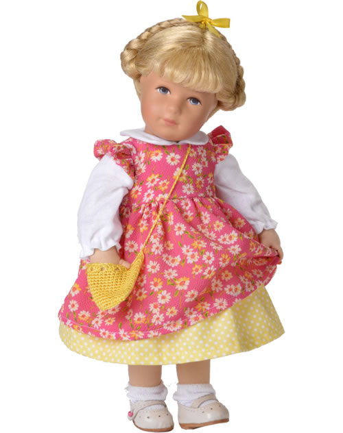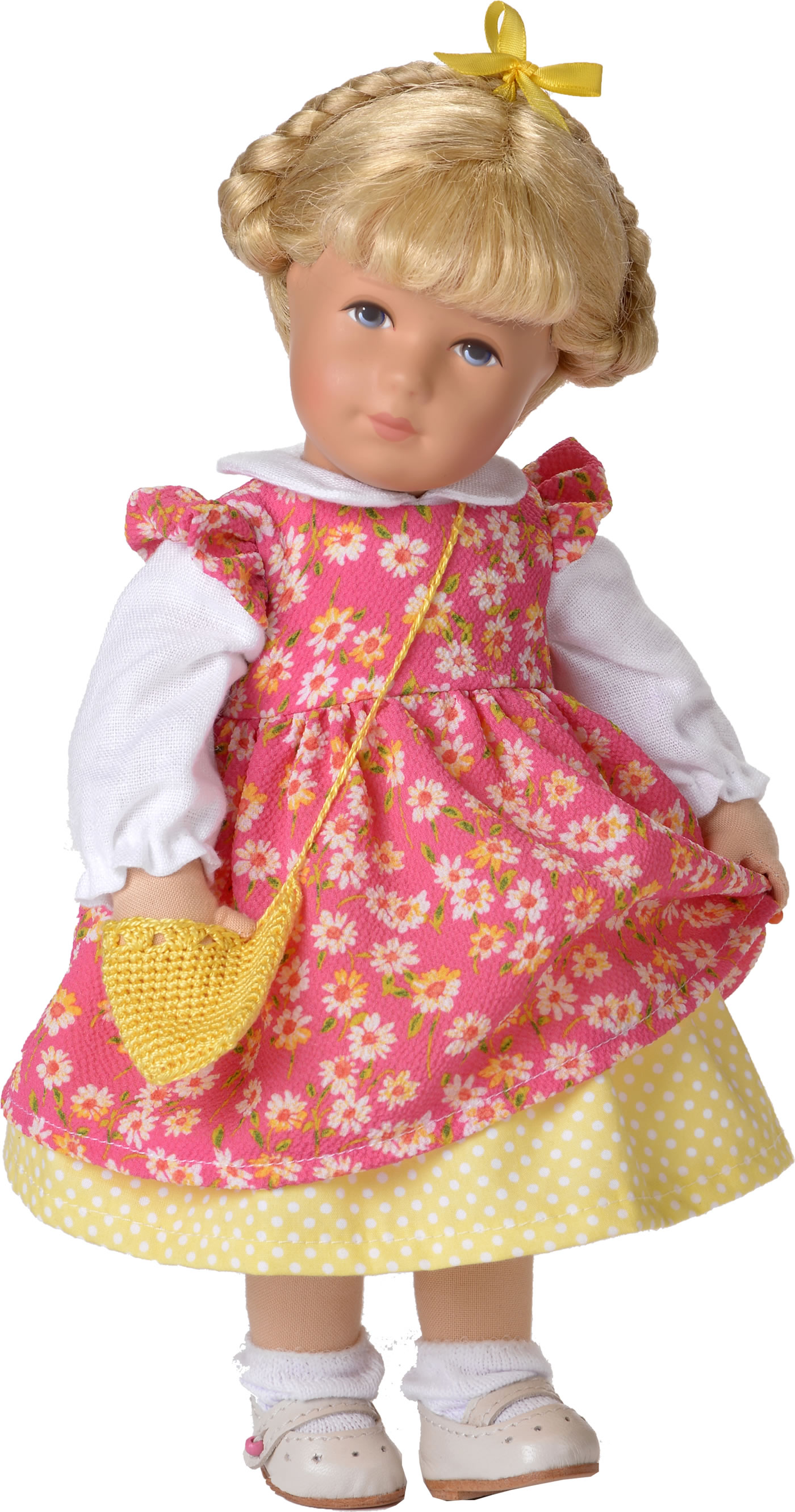 Cornelia trägt ein frisches gelbes Tupfen Kleid, welches ein Leinenoberteil mit einem Bubikragen. Darüber hat sie eine luftige geblümte Schürze in frischer Farbe und Rüschen am Ärmelausschnitt angezogen. Unter dem Kleid trägt Cornelia eine Pumphose. Ihre in Handarbeit gehäkelte Tasche in passenden gelb hat sie immer dabei.
