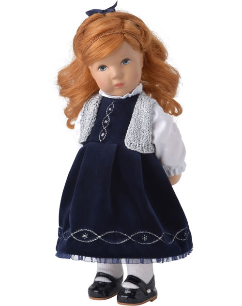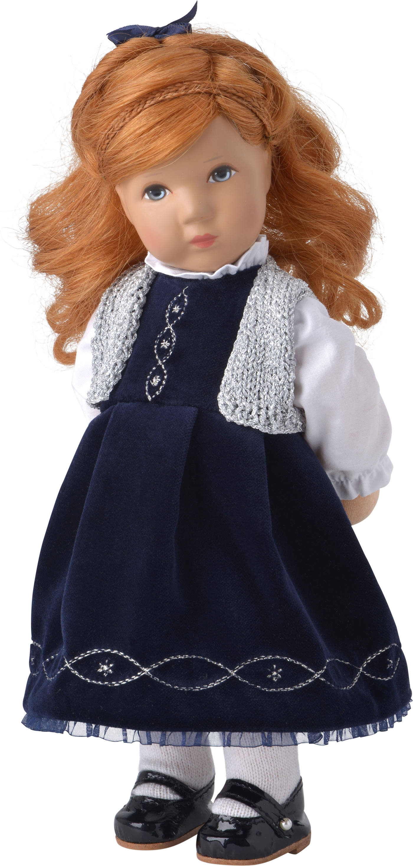 Däumlinchen® Annabell trägt ein festliches blaues Samtkleid, das mit aufwendiger Stickerei im Vorderteil verziert ist. Ihre hand- gestrickte silber farbene Weste passt bestens zu dem Kleid. Dazu trägt Annabell schwarze Lackschuhe.