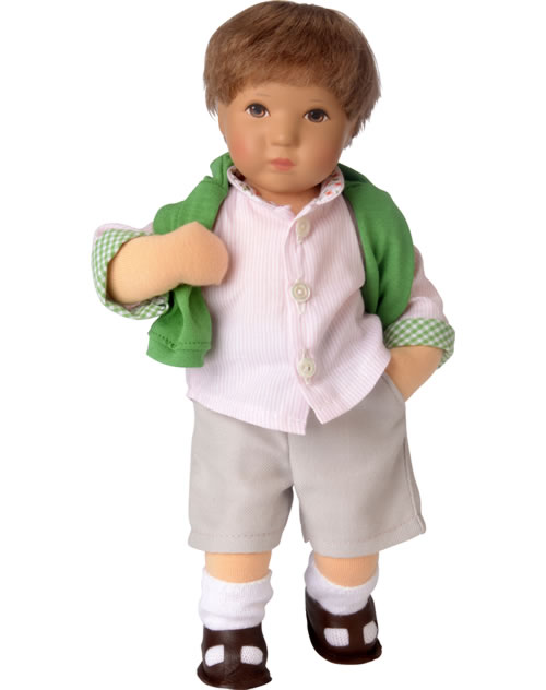 Bekleidet ist er mit einem sportlichen rosa weiß gestreiften Hemd und einer flotten grauen 7/8 Hose. Den grünen Pullover hat der Puppenjunge leger über seine Schultern gelegt. Dazu trägt Krümel weiße Strümpfe und braune Schuhe.