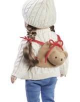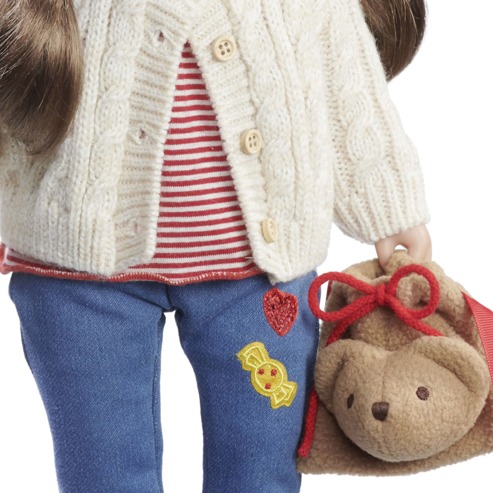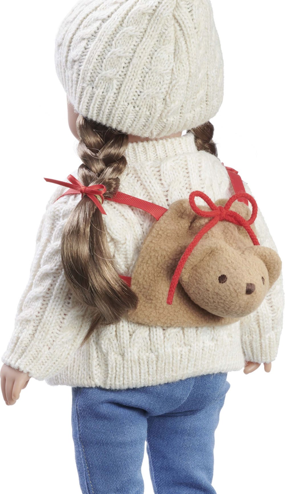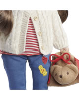Arianna trägt ein rot-weiß geringeltes Shirt und eine Jeggings mit bunten Applikationen. Für die kalte Jahreszeit hat sie eine beige Strickjacke und eine passende Mütze mit Bommel. An den Füßen trägt sie Turnschuhe. In ihrem kleinen Bären-Rucksack kann sie Kleinigkeiten mitnehmen. Arianna ht braune Haare und grüne Augen. Ihr Gesicht ist mit lustigen Sommersprossen gesprenkelt.