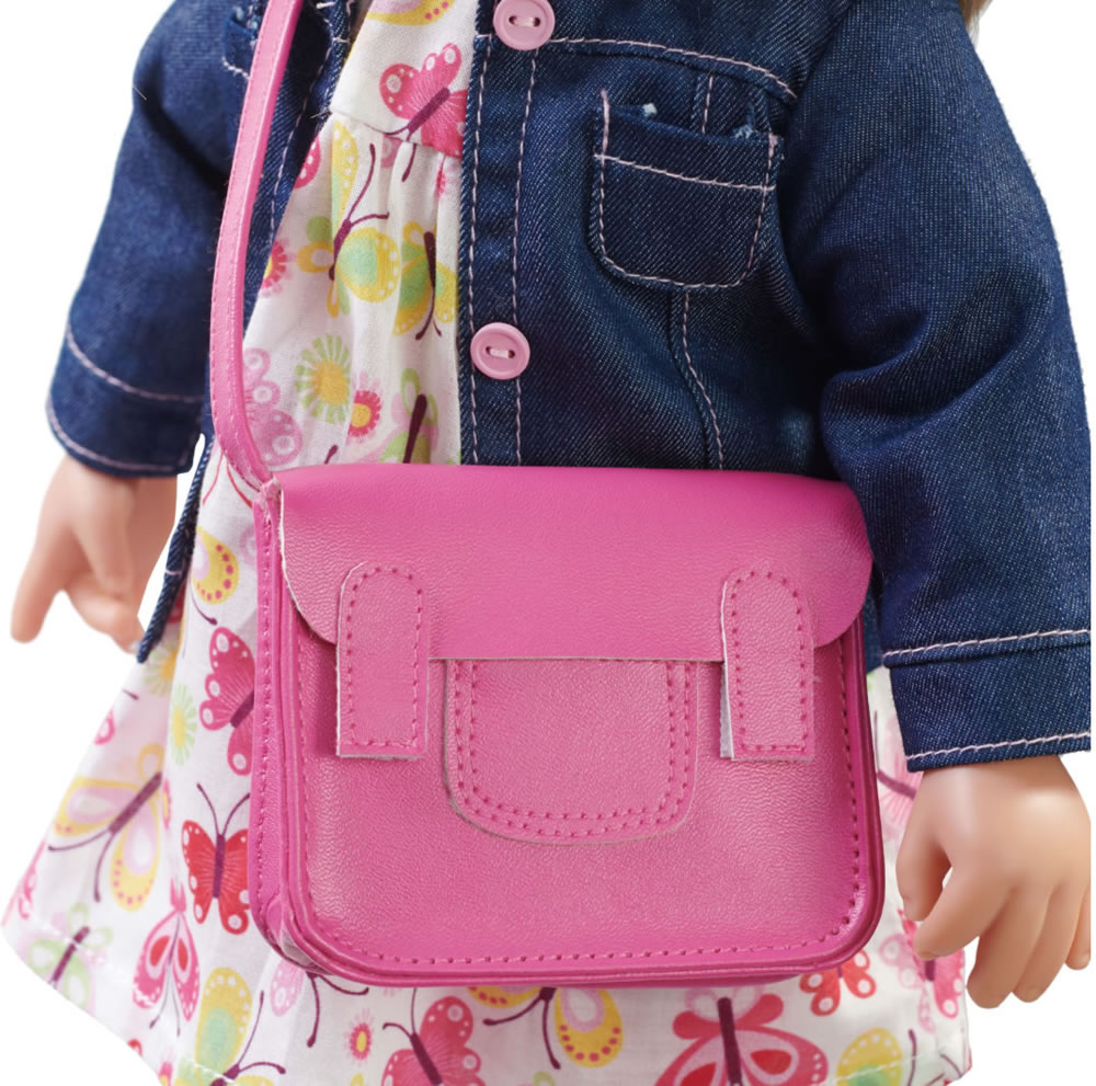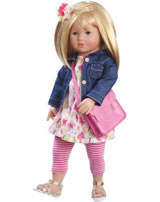 Die blonde Emilie trägt ein buntes Kleid mit Schmetterlingen und darüber eine Jeans-Jacke. Unter dem Kleid schaut eine pink geringelte Leggings hervor. An den Füßen trägt sie goldene Sandalen. In ihrer pinkfarbenen Umhängetasche kann Emilie Kleinigkeiten verstauen. Emilie hat braune Augen.