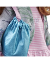 Pippi trägt eine rosa geringelte Tunika mit einem Glitzerherz. Darüber hat sie eine bunte Sweat-Jacke angezogen. Sie trägt eine pinkfarbene Hose und eine passende Mütze dazu. An den Füßen trägt sie Turnschuhe. In ihrem Turnbeutel kann sie einige Kleinigkeiten verstauen.