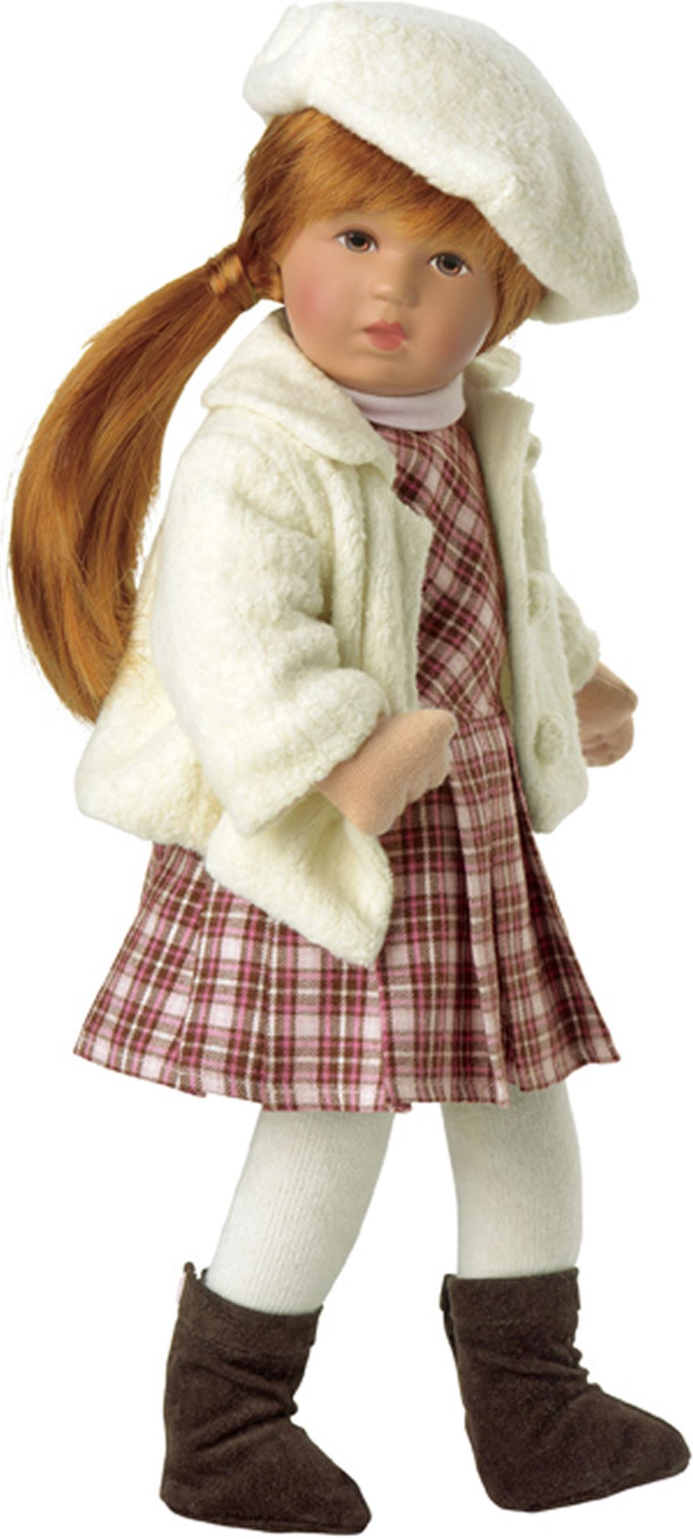 Mary sieht bezaubernd aus in ihrem kariertem Flannelrock und dem rosa T-Shirt. Dazu trägt sie eine wärmende naturfarbene Jacke mit einer flotten passenden Mütze. Ihre Velours-Lederstiefel sind von Hand gearbeitet und sehen toll zu der Bekleidung aus.