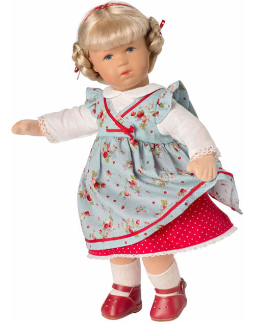 Jana das niedliche Puppenkind Jana trägt ein sommerliches Kleid. Das naturfarbene Oberteil ist aus Leinen und der rote Rock aus Baumwollgewebe gefertigt und mit zarter Spitze besetzt. Über dem Kleid trägt Jana eine Schürze mit frischem Beerendruck und Flügelärmeln. Die Schürze wird mit einer großen Schleife im Rücken geschlossen. Ihre blonden Haare sind zu braven Schnecken frisiert und mit einem farblich passenden Tupfenband verziert. Das Mädchen hat strahlend blaue Augen die mit der Kleidung bestens harmonieren.