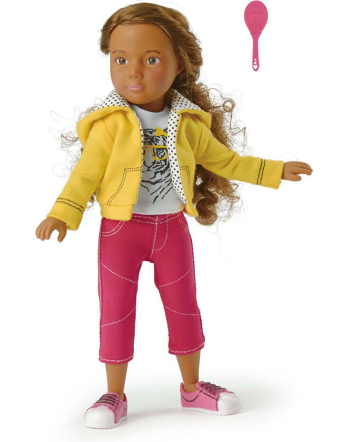 Puppe aus hochwertigem Vinyl, mit beweglichen Gelenken und lebensecht aussehenden Glasaugen.
