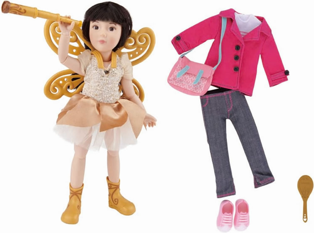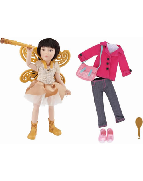 Luna hat schwarze Haare und braune Augen. Sie trägt ein goldenes Kleid, Flügel, Stiefel und ihr magisches Fernglas.