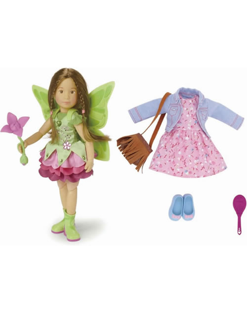 Sofia hat braune Haare und braune Augen. Sie trägt ein grünes Kleid, Stiefel, Flügel und ihre magischen Blume.