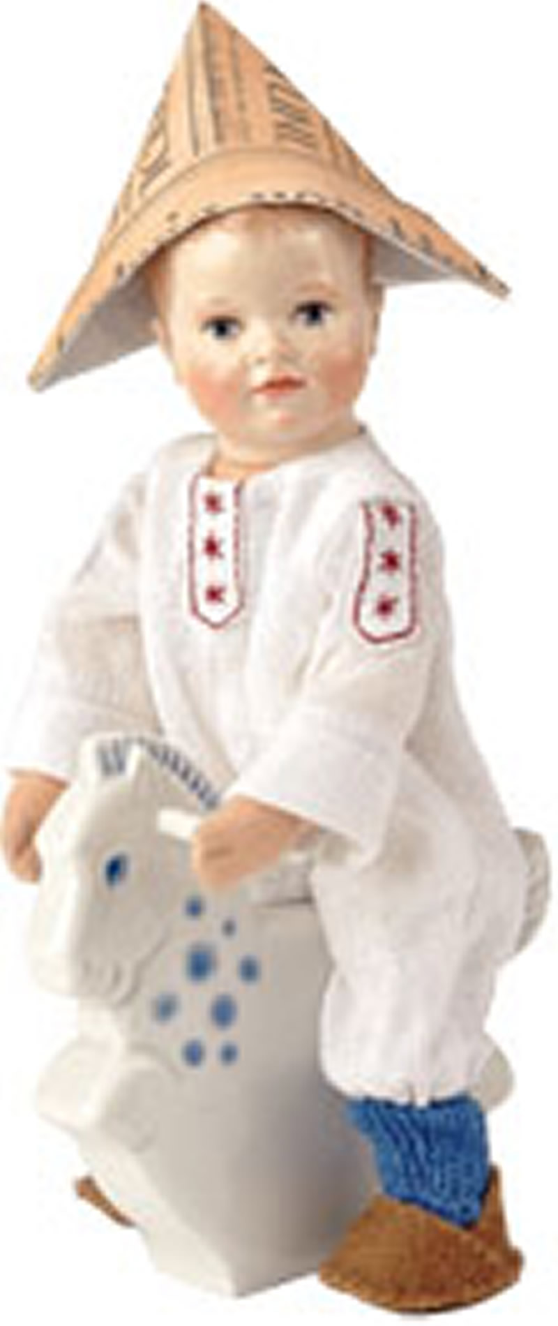 Fritz sitzt auf einem Meissner Porzellan Schaukelpferd und trägt kess eine gefaltete Zeitung auf seinem Kopf.
