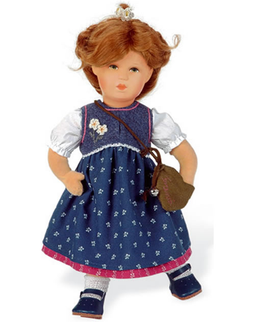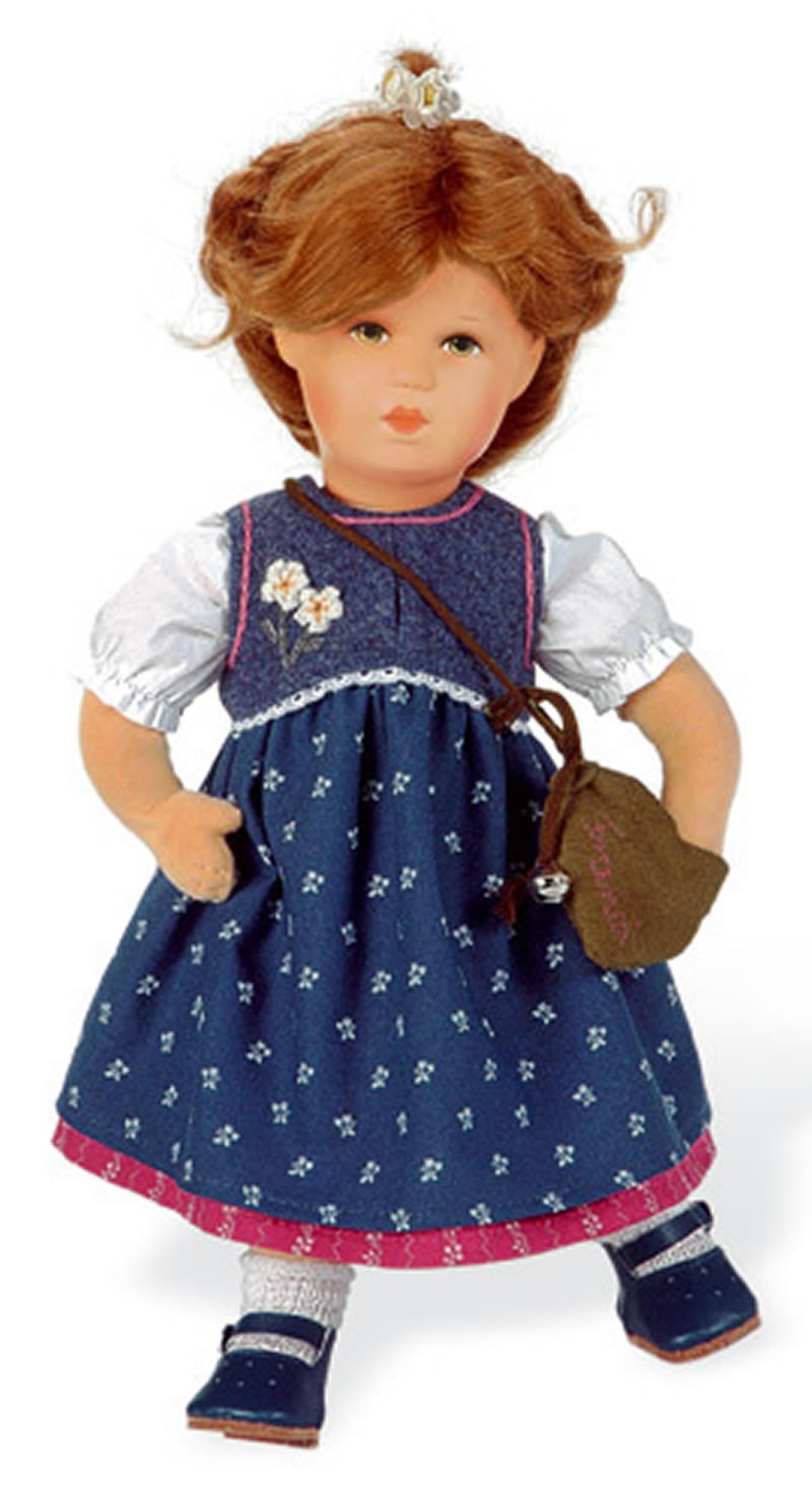Franziska ist ein 34 cm großes Schummelchen. Der weiche Puppenkörper aus Schaumstoff ist um ein flexibles Drahtskelett geschäumt und mit Trikotstoff überzogen. Der Polystyrolkopf ist liebevoll von Hand bemalt, die grünen Augen sind besonders ausdrucksvoll. Das Echthaar trägt Franziska locker geflochten und hochgesteckt. In einem bayerischen Trachtenkleid und weißer Bluse geht Franziska zum Maientanz. Weiße Strümpfe, blaue Lederschuhe und eine bestickte Tasche mit Glöckchen vervollständigen den Trachtenlook.