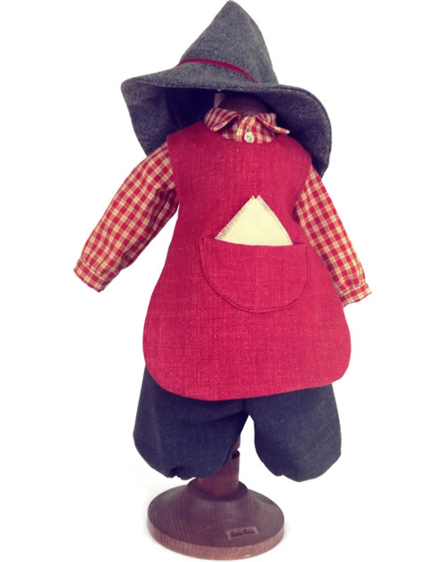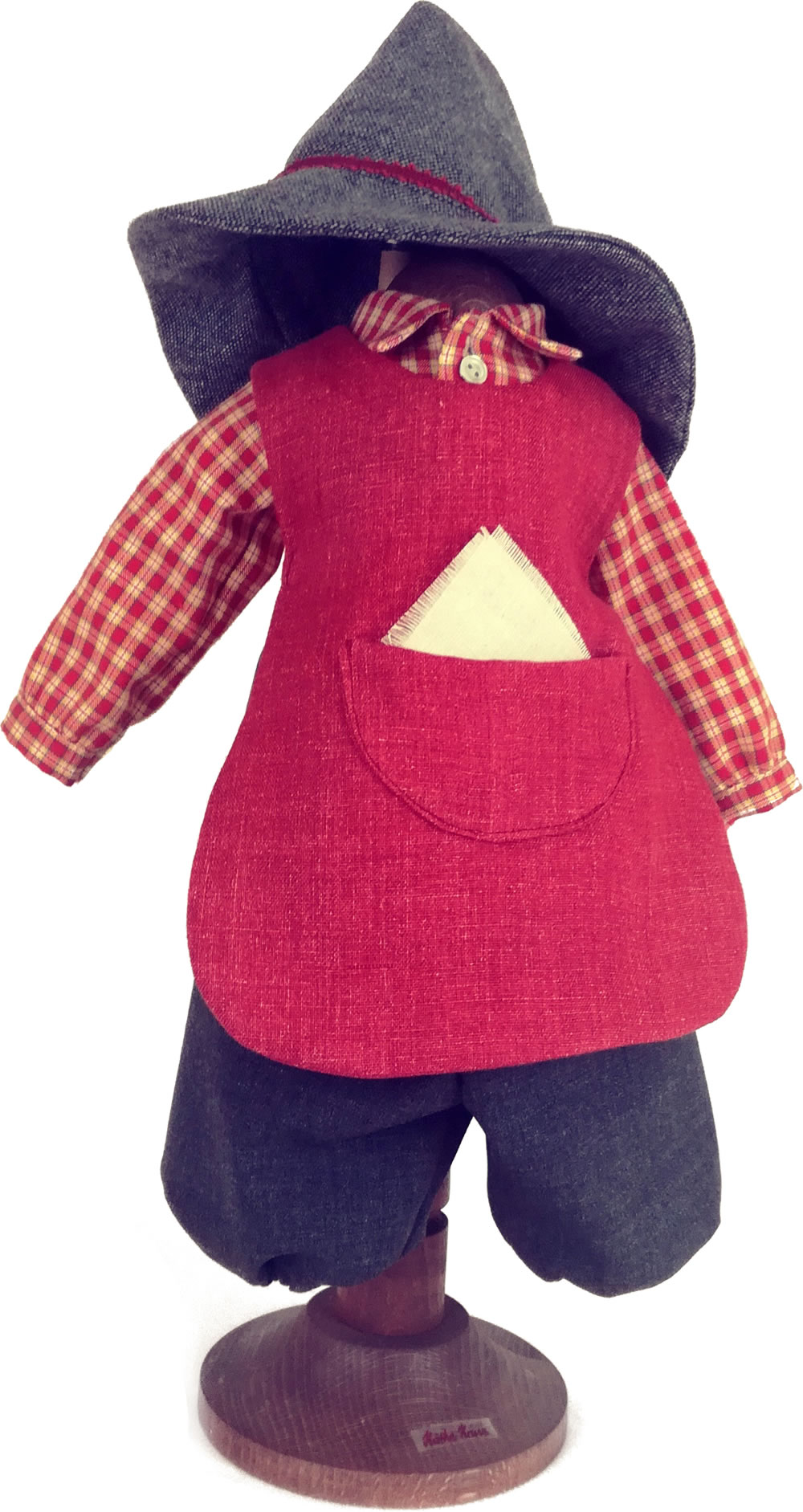 Kariertes Hemd mit passender rostfarbener Schürze , grauer Pumphose und einem grau melierten Hut.