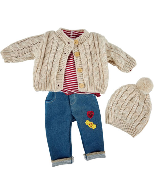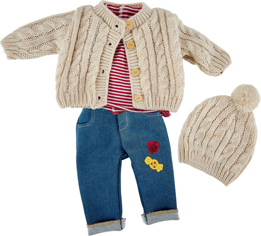 Das 4-teilige Outfit besteht aus einem geringelten Shirt, einer beigen Strickjacke, einer Jeans mit Applikationen und einer Strickmütze mit Bommel.