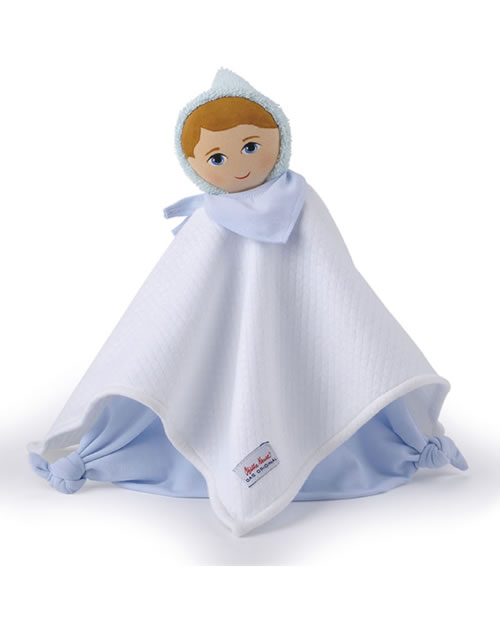 Das Schmusetuch ist nach einer Vorlage des ersten Schmusetuchs von 1997 entstanden. Das Gesicht ist liebevoll von Hand bemalt. Die fest angenähte Mütze ist in der Farbe mint. Der Körper besteht aus zwei Lagen: der weisse Baumwollpiquestoff symbolisiert die Arme, der darunter liegende mintfarbene Baumwolljersey mit den geknoteten Enden, die Beine. Das Schmusetuch ist liebevoll in einem hochwertigen Geschenkkarton verpackt und ein perfektes Geschenk für jedes Kind.