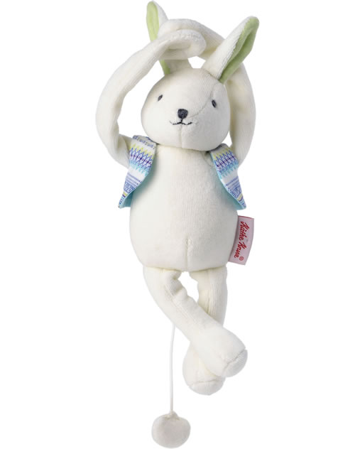 Der Hase Buddy ist Spieltier und Spieluhr zugleich. Die Spieluhr spielt die Melodie "Brahms Wiegenlied". Die Ohren, Arme und Beine sind für Kinderhände ideal zum Greifen. Die Arme können durch einen Klettverschluss verschlossen werden, so dass man die Spieluhr überall anbringen kann, wie beispielsweise am Autositz, Buggy oder Kinderwagen. Der kleine Hase trägt eine gemusterte Weste aus Baumwolljersey. Das Gesicht ist von Hand bestickt. Die Ohreninnenseiten sind mit grünem Baumwolljersey farblich abgesetzt. Der Körper aus sehr hochwertigem weichen Nickistoff ist mit Füllwatte gefüllt. Liebevoll in einem Geschenkkarton verpackt, ist es ein perfektes Geschenk für jedes Kind