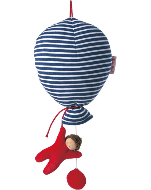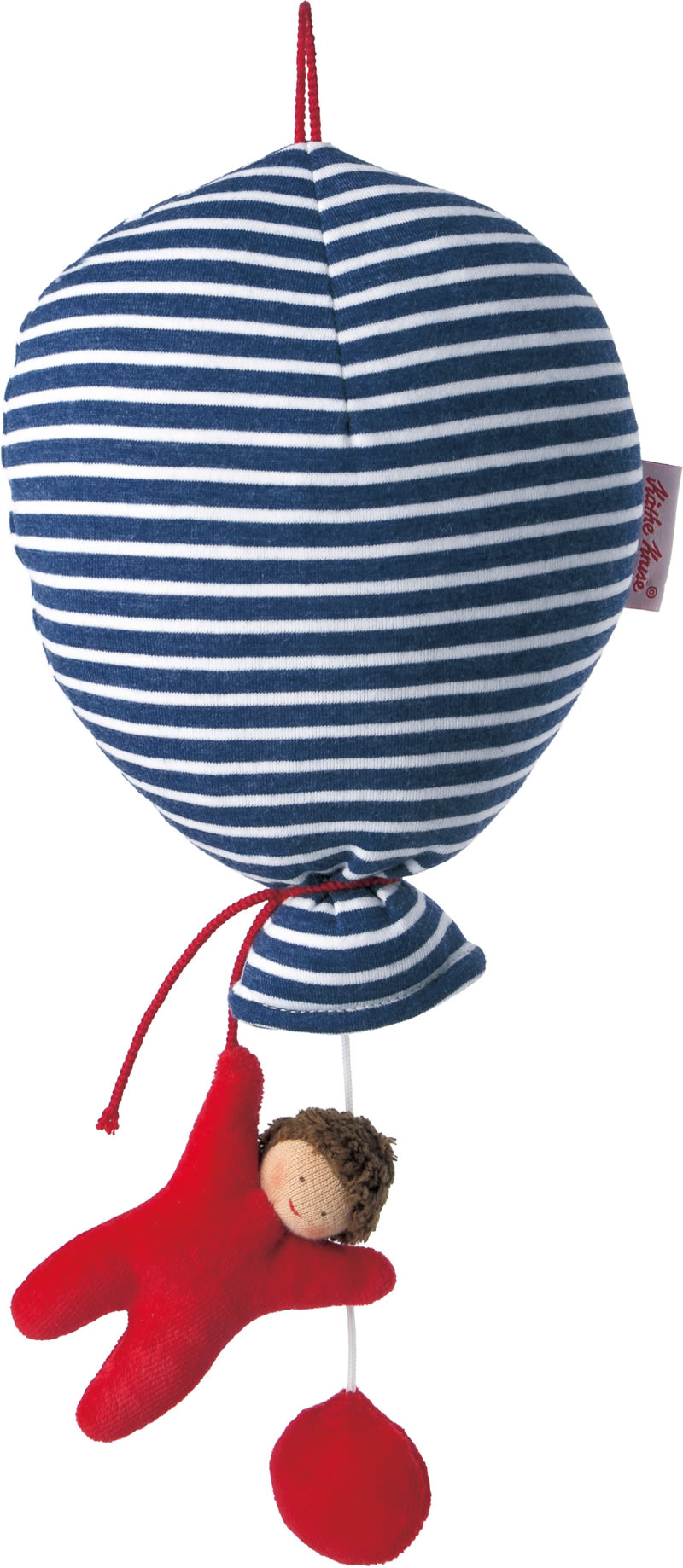 Der kleine Lausbub aus weichem roten Nickistoff fliegt mit seinem Heißluftballon davon. Die Spieluhr lässt sich durch einen kleinen Aufhänger überall leicht anbringen. Der Heißluftballon ist aus blau-weiss gestreiftem Baumwolljerseystoff. Im Inneren verbirgt er eine Spieluhr, die durch einen Reißverschluss leicht herauszunehmen ist, damit die Spieluhr gewaschen werden kann. Die Spieluhr spielt das Lied "Mozarts Wiegenlied". Der kleine Lausbub hängt an der Aufziehschnur der Spielzeuguhr und kann sich so zu dem Heißluftballon hinaufhangeln. Liebevoll in einem Geschenkkarton verpackt, ist es ein perfektes Geschenk für jedes Kind.