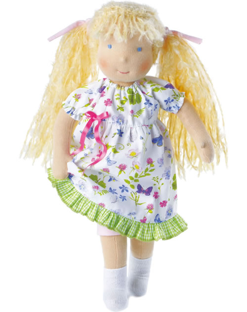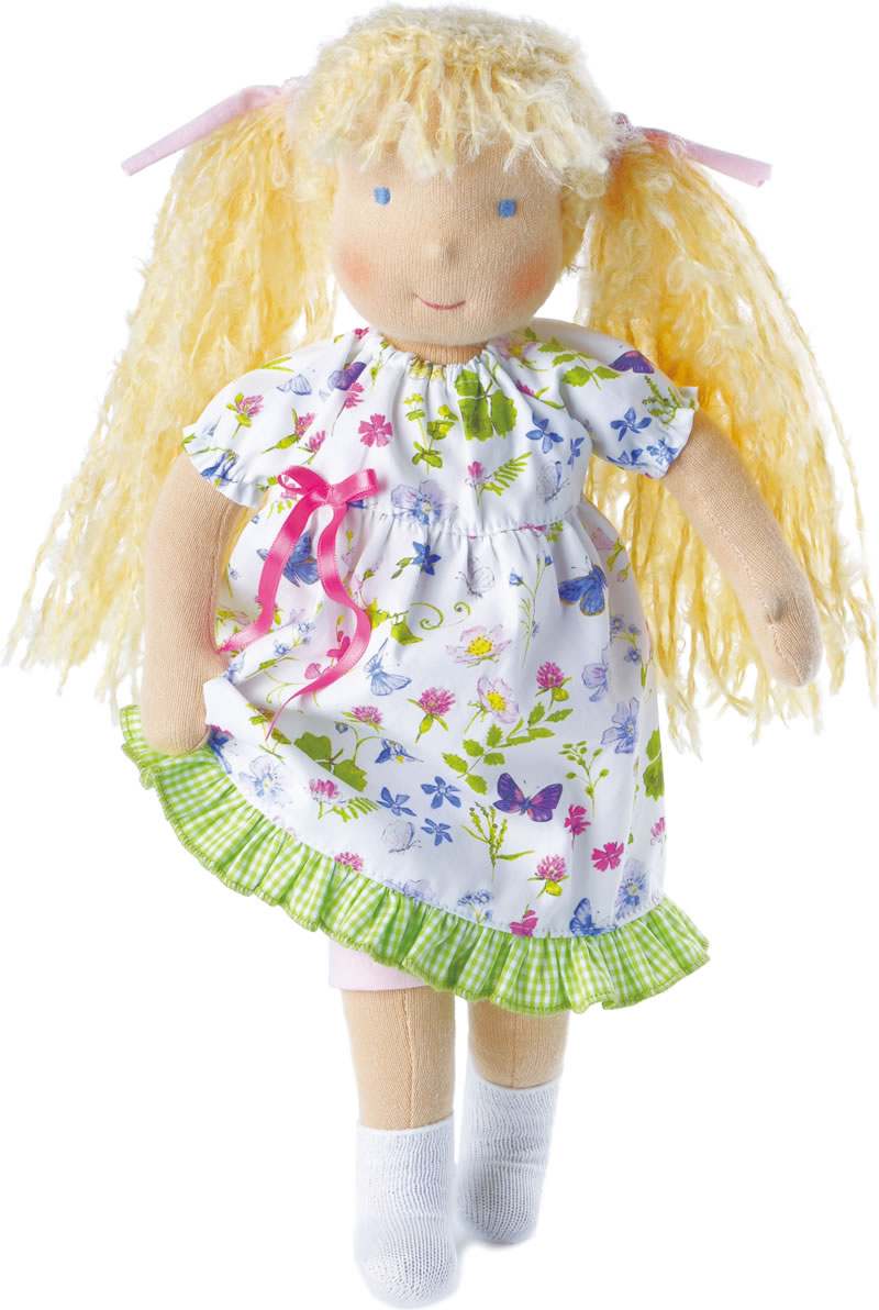 Die Waldorfpuppe Anna ist von Hand gefertigt. Sie hat sehr weiche Haare aus Boucléwolle, die zu zwei Zöpfen gebunden sind. Sie trägt ein romantisches Kleid aus Baumwolle mit bunten Blüten und Schmetterlingen bedruckt. Das Kleid ziert seitlich eine rosa Schleife. Der Rocksaum ist mit grünen Rüschen eingefasst. Das Kleid ist ganz einfach - auch für Kinderhände - per Klettverschluss von hinten zu schliessen. Darunter trägt sie eine rosa Legging und weisse Söckchen aus Baumwolle.