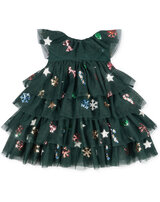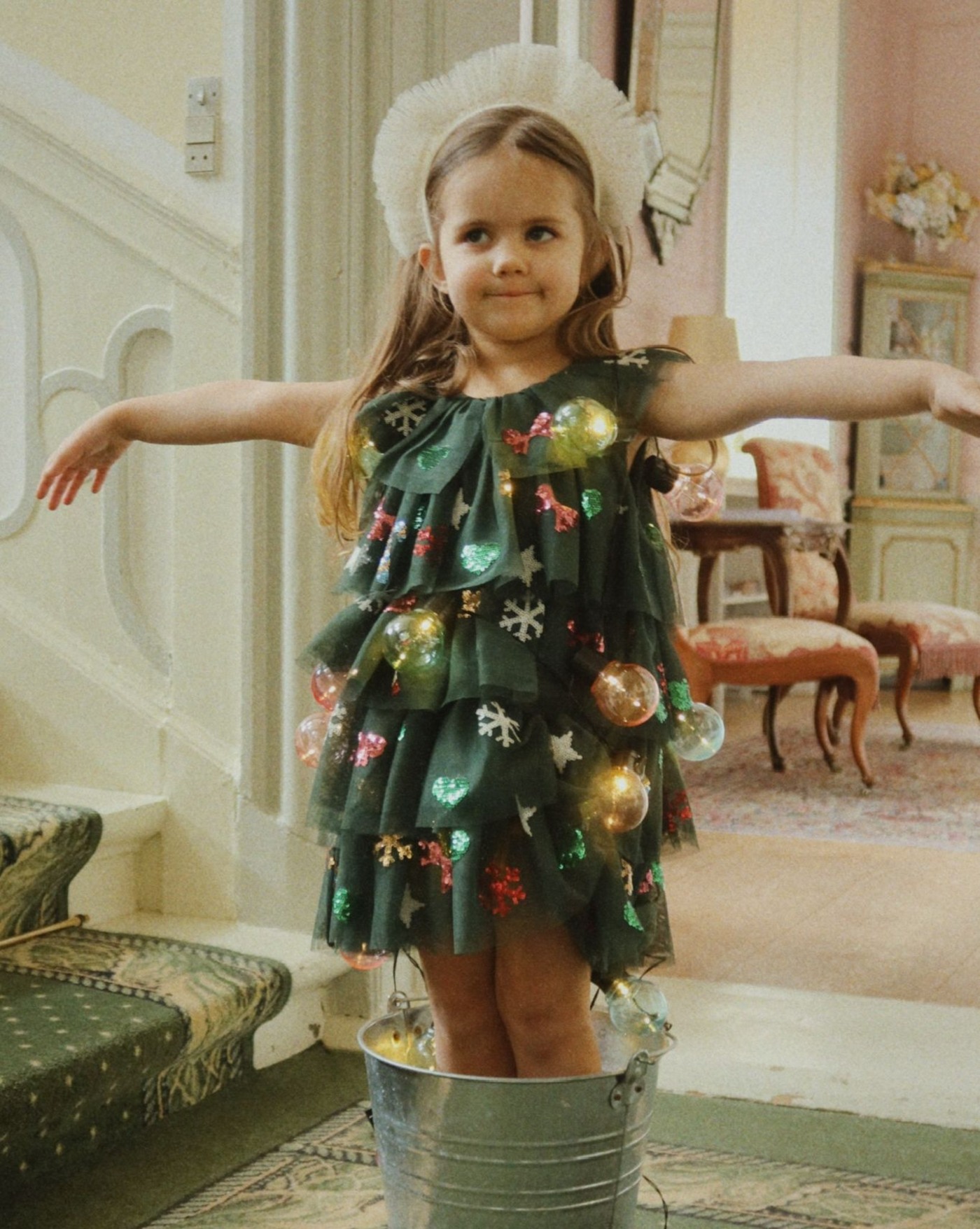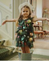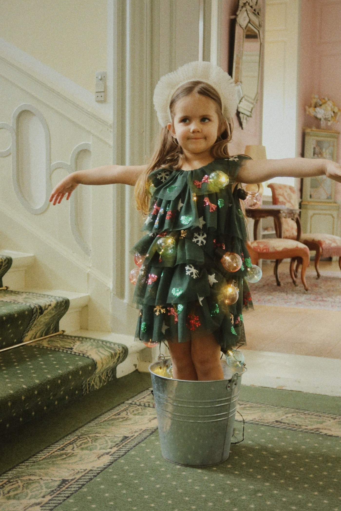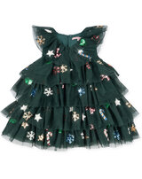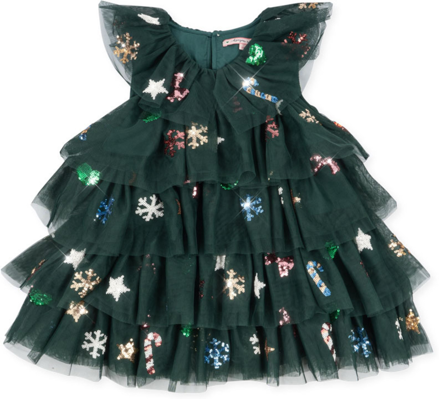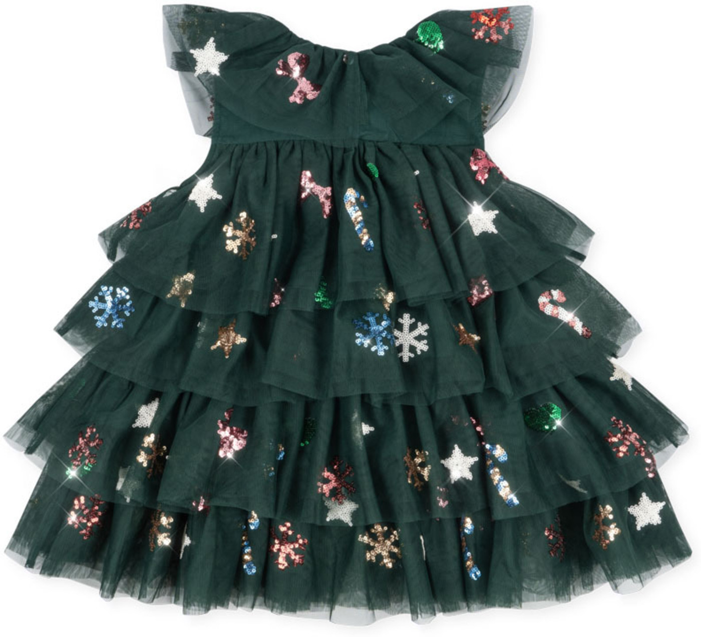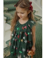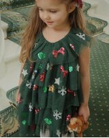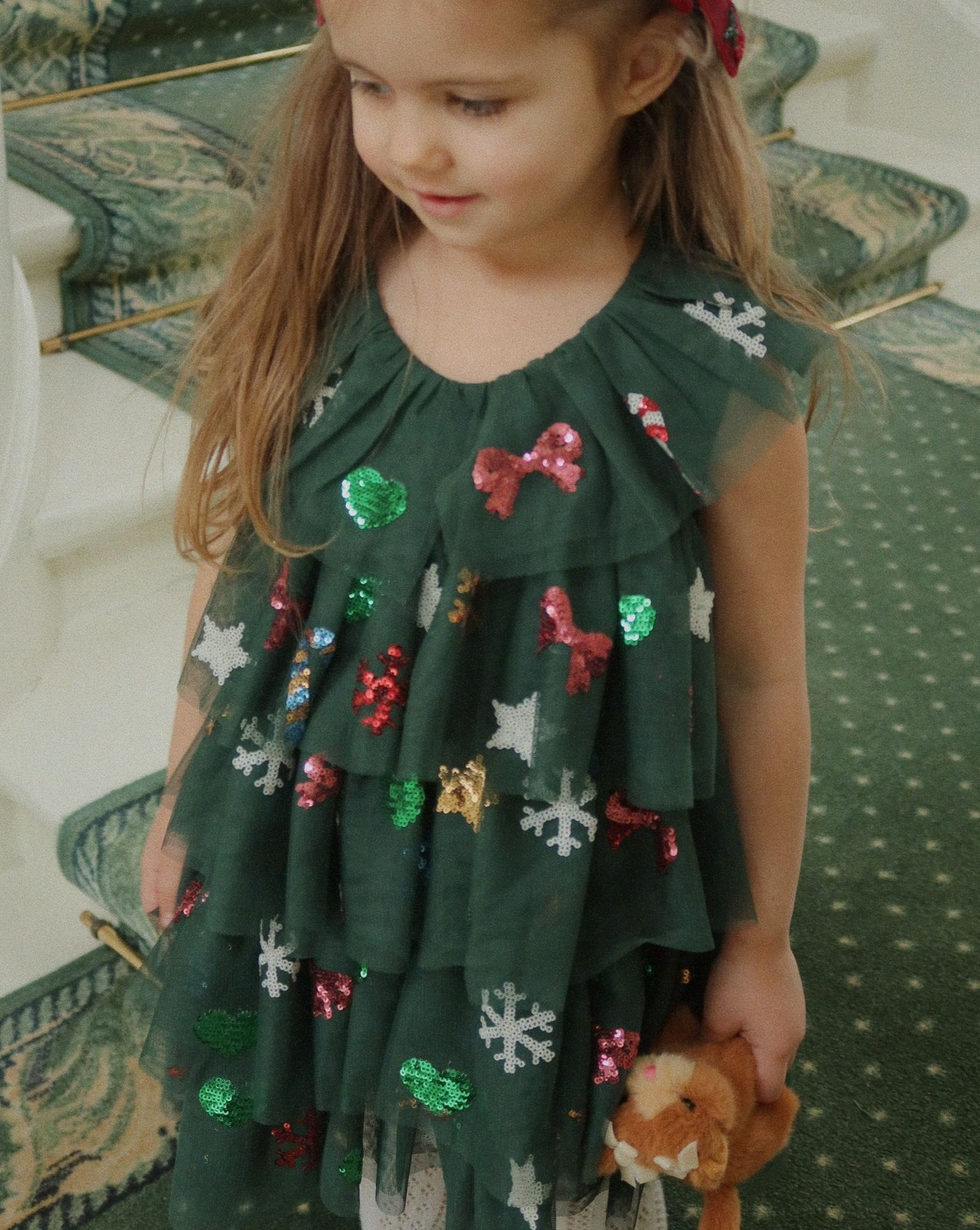Mit funkelnden Pailletten-Symbolen im zauberhaften Weihnachtsflair – darunter Schneeflocken, Sterne, grüne Herzen, Zuckerstangen und Schleifen – zieht dieses Kleid alle Blicke auf sich.💚 ❄ 🎀 🌲