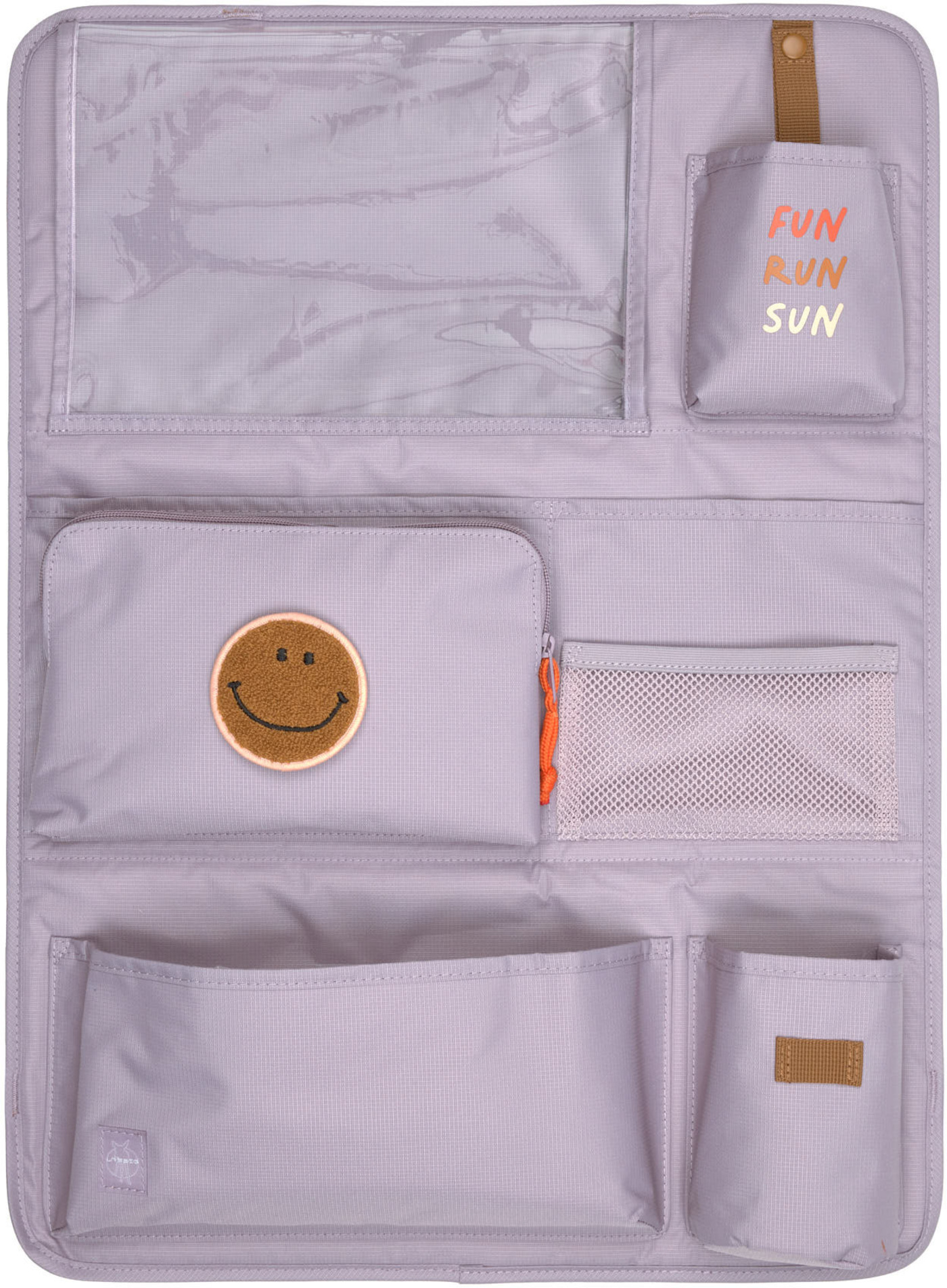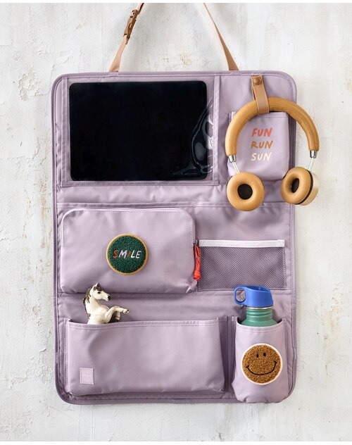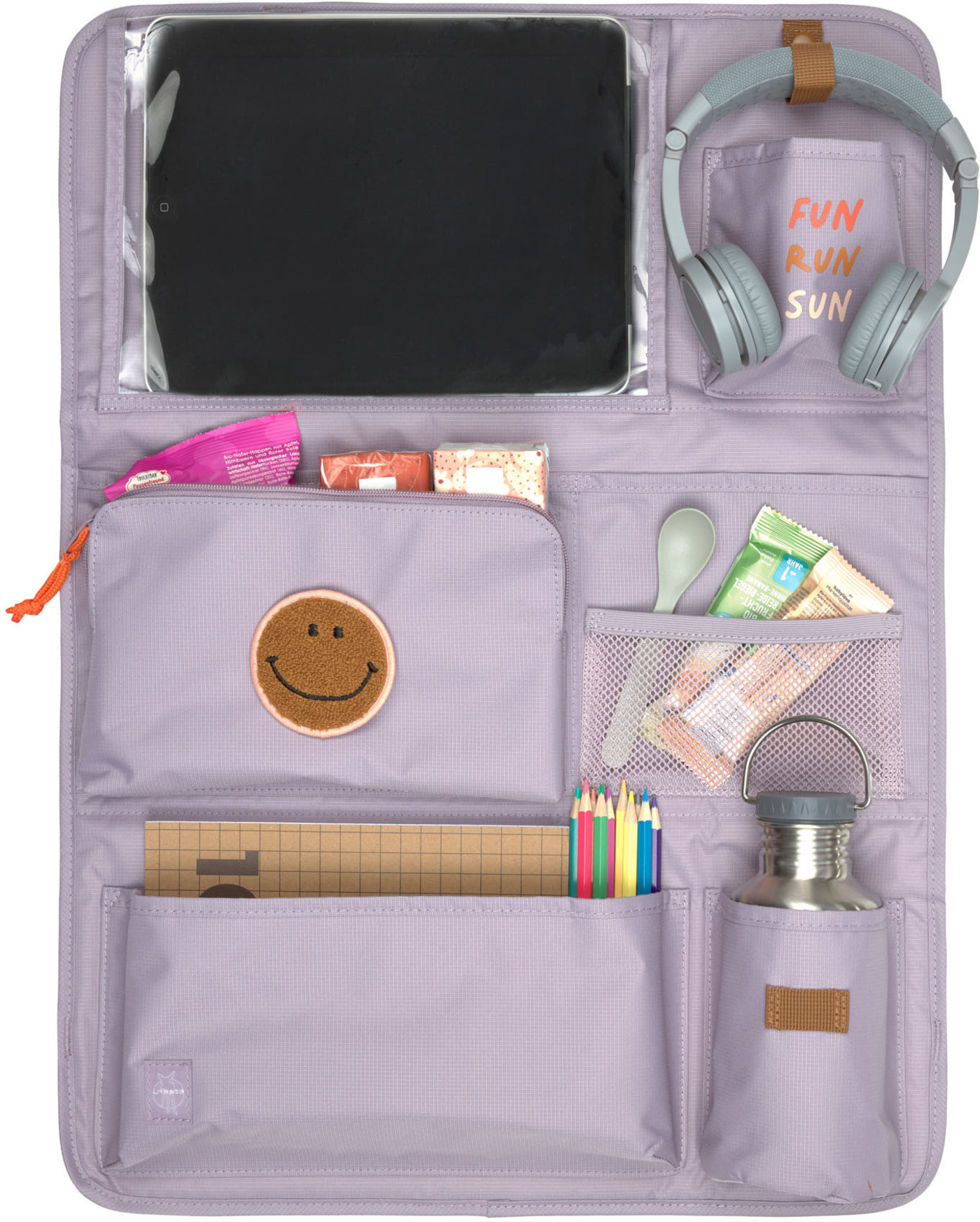 Durch die einfache Befestigung am Rücksitz und die zahlreichen funktionalen Staufächer mit Klett- und Reißverschlüssen haben die Kinder alles Wichtige wie Schmusetier, Trinkflasche, Spielzeug und Snacks in greifbarer Nähe.
