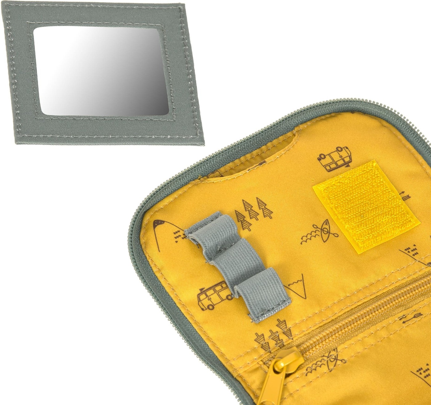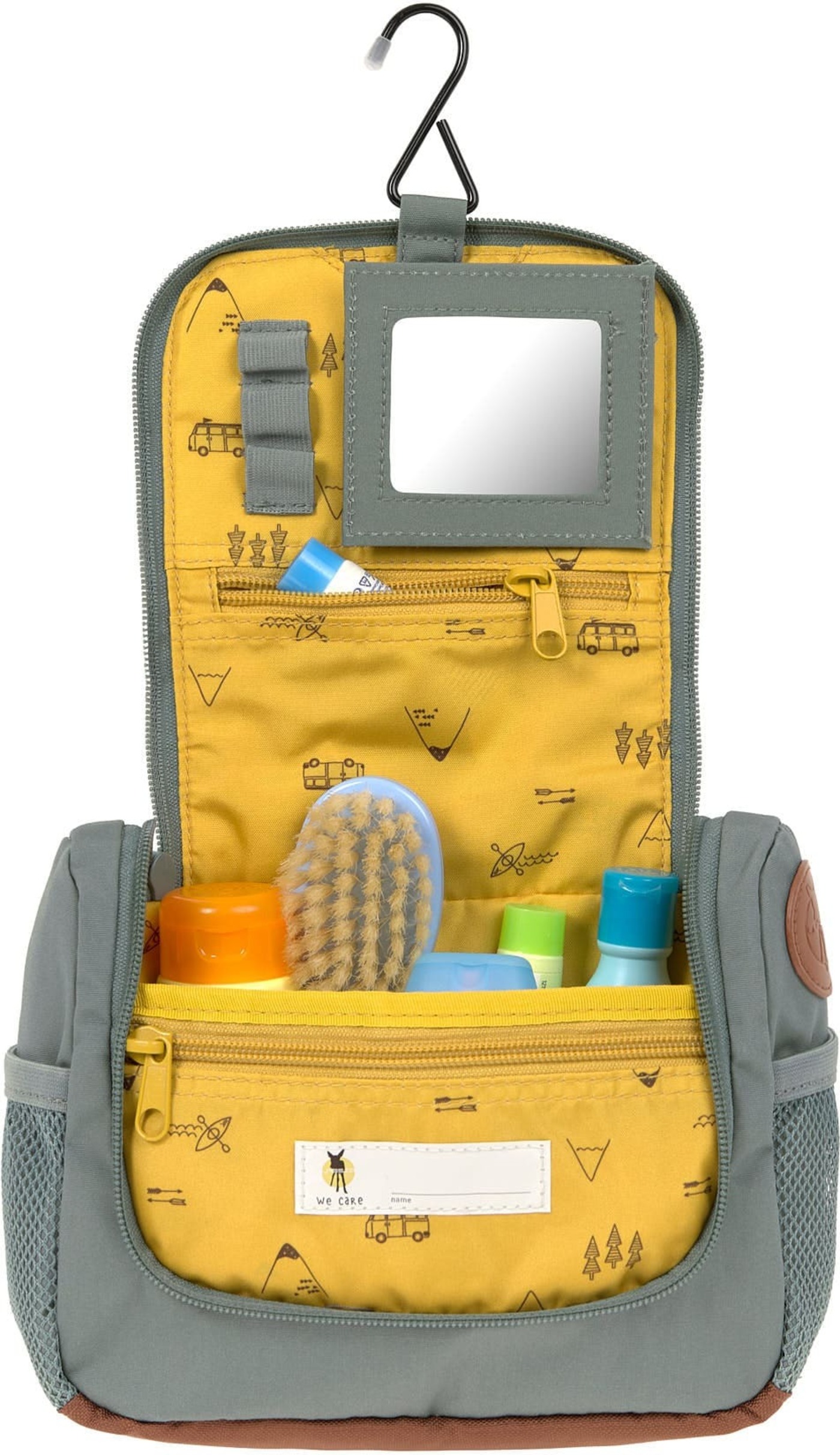 Besonders praktisch bei diesem Kinder Kulturbeutel sind das wasserabweisende Außenmaterial, der Haken zum Aufhängen und der im Set enthaltene abnehmbare Spiegel.