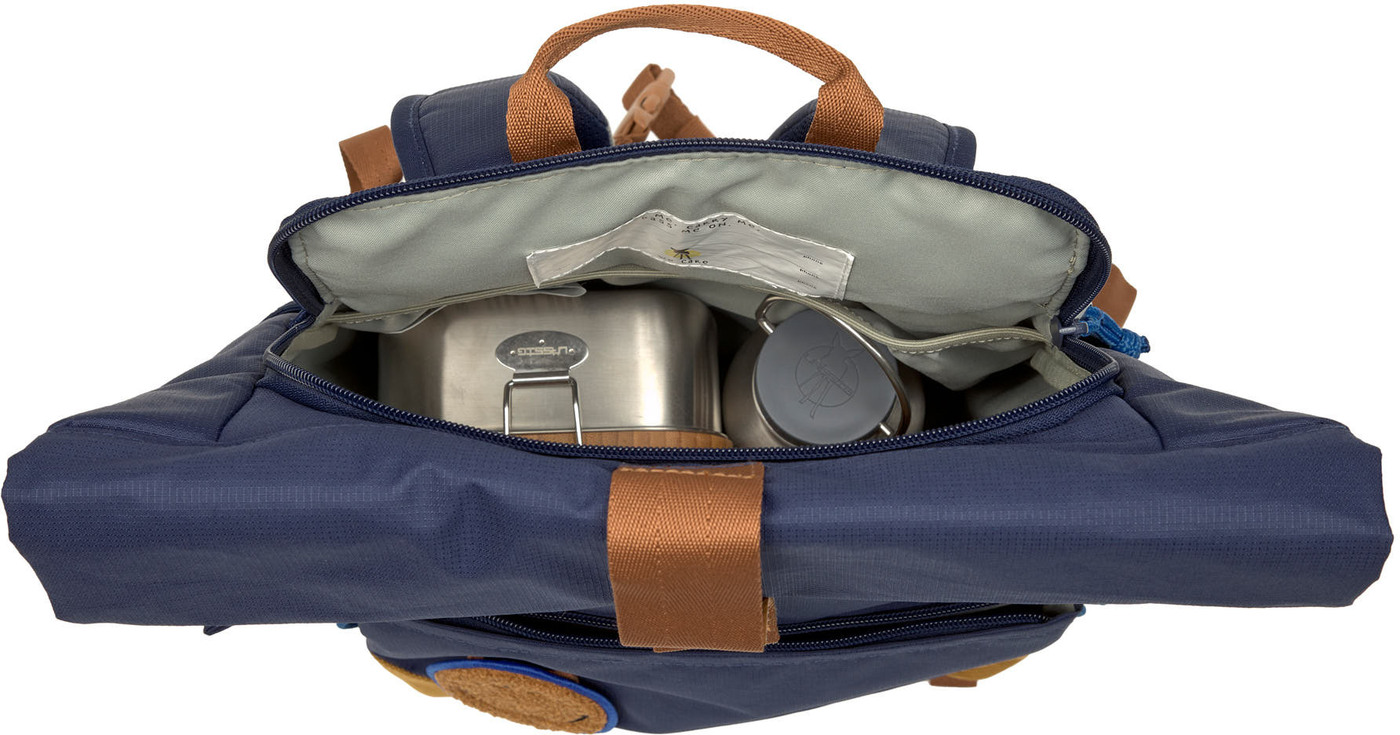 Das große Hauptfach lässt sich über einen Klettverschluss kinderleicht öffnen, eine zusätzliche Reißverschluss-Öffnung am Rücken bietet schnellen Zugriff.