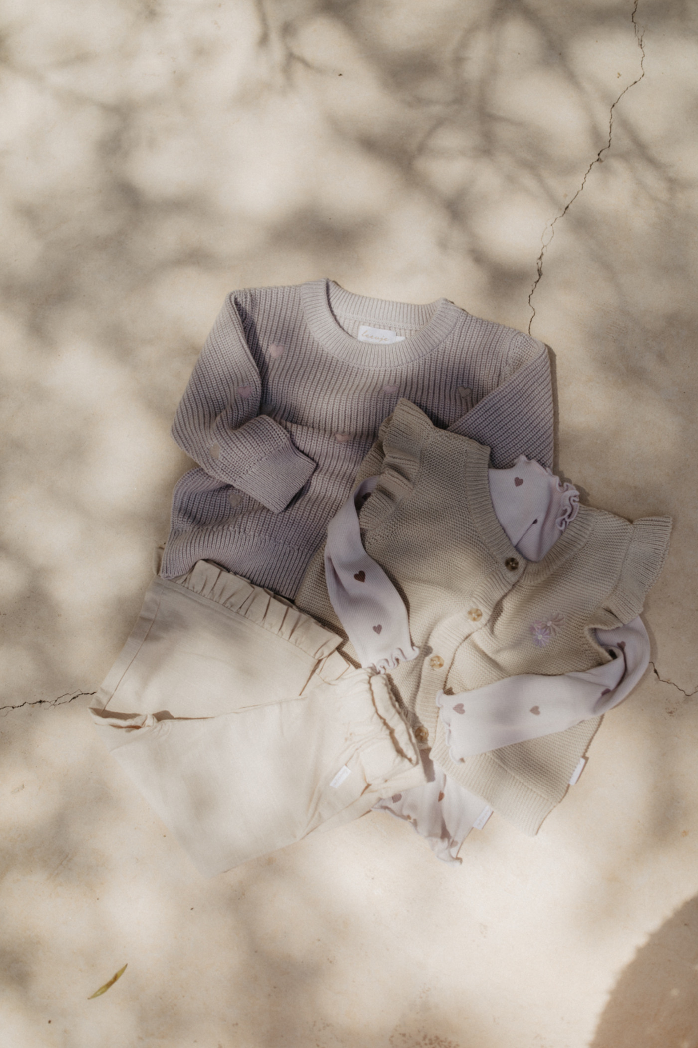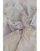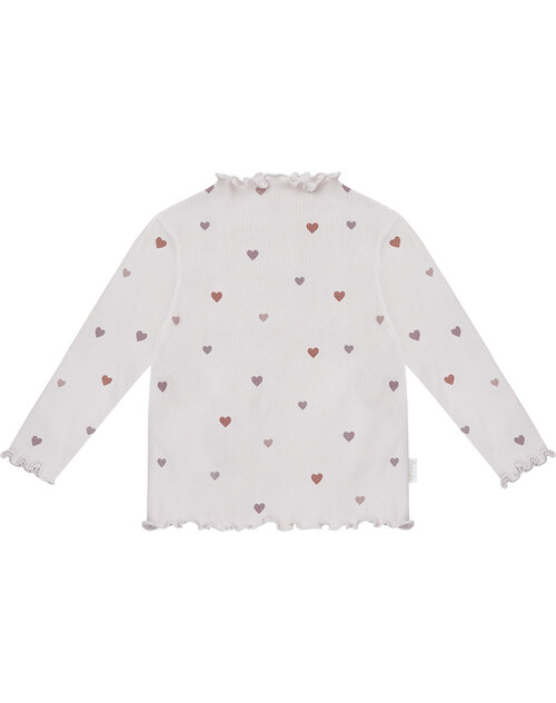 Dieses wünderschöne Lamgarm-Shirt mit dezent gerüschtem Kragen, Armenden und Saum von Leevje ist ideal für stylische Kids, denn es ist super bequem und mit den dezenten aber farbenfrohen Herzchen edel zugleich. 🤍