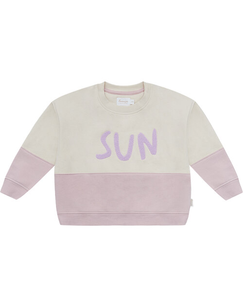 Dieses wünderschöne Sweatshirt von Leevje wird mit der hochwertigen Frottee-Stickerei „SUN“ und dem zweifarbigem Design zum Highlight für den Sommer. 🤍