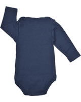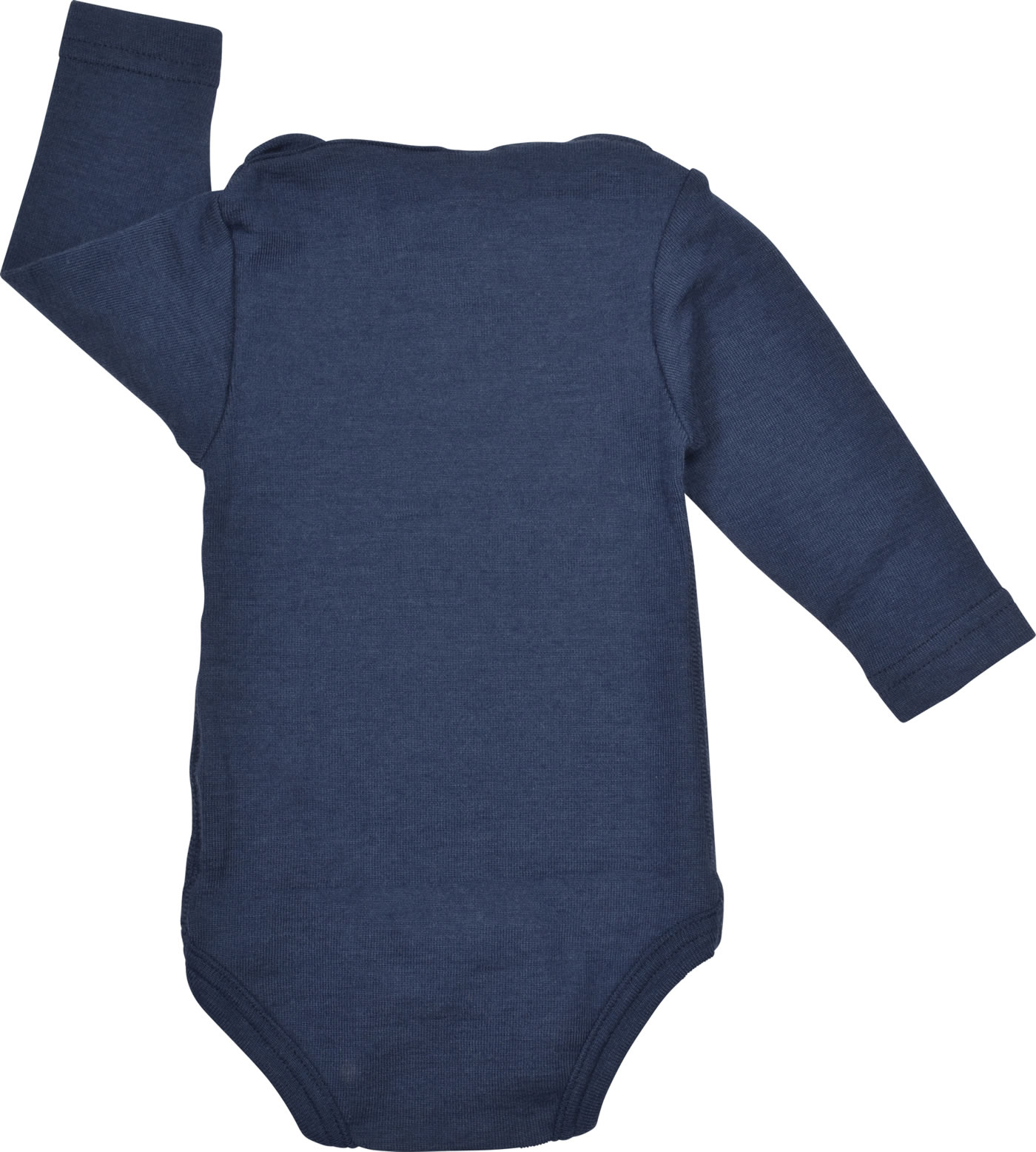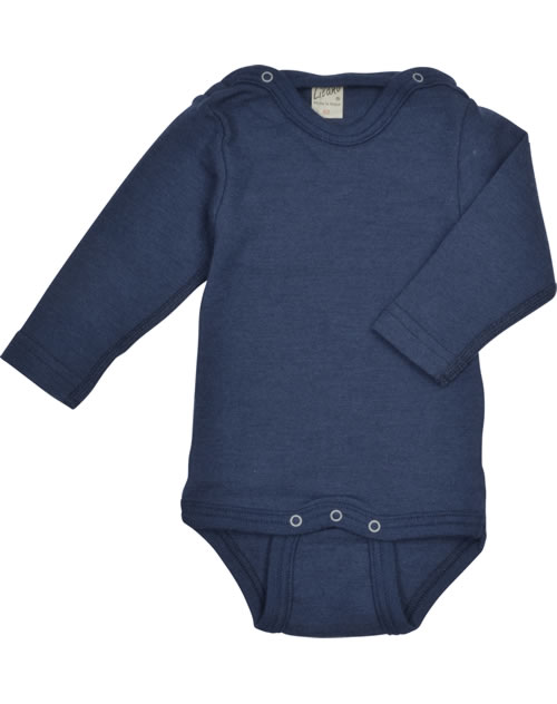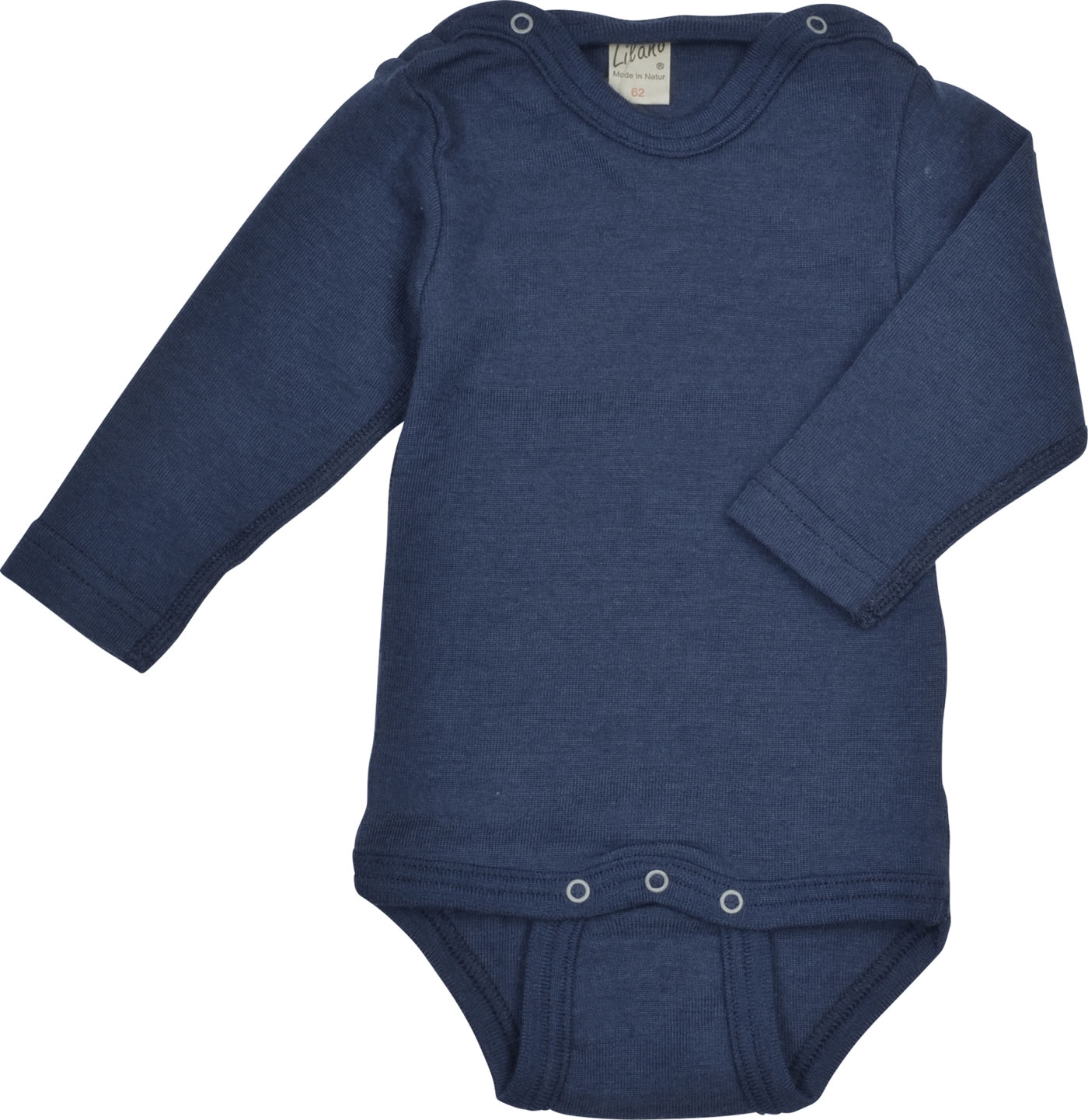 Weicher Langarm-Body in marine-blau aus Schurwolle und Seide für Babys von LILANO. Ein praktisches Detail sind die Druckknöpfe im Schulterbereich und im Schritt, dank deren das An- und Ausziehen einfacher gestaltet wird. Das ökologisch hochwertige Material des Kleidungsstücks beeinflusst das Hautklima positiv und sorgt für ein angenehmes Tragegefühl.
