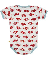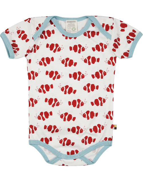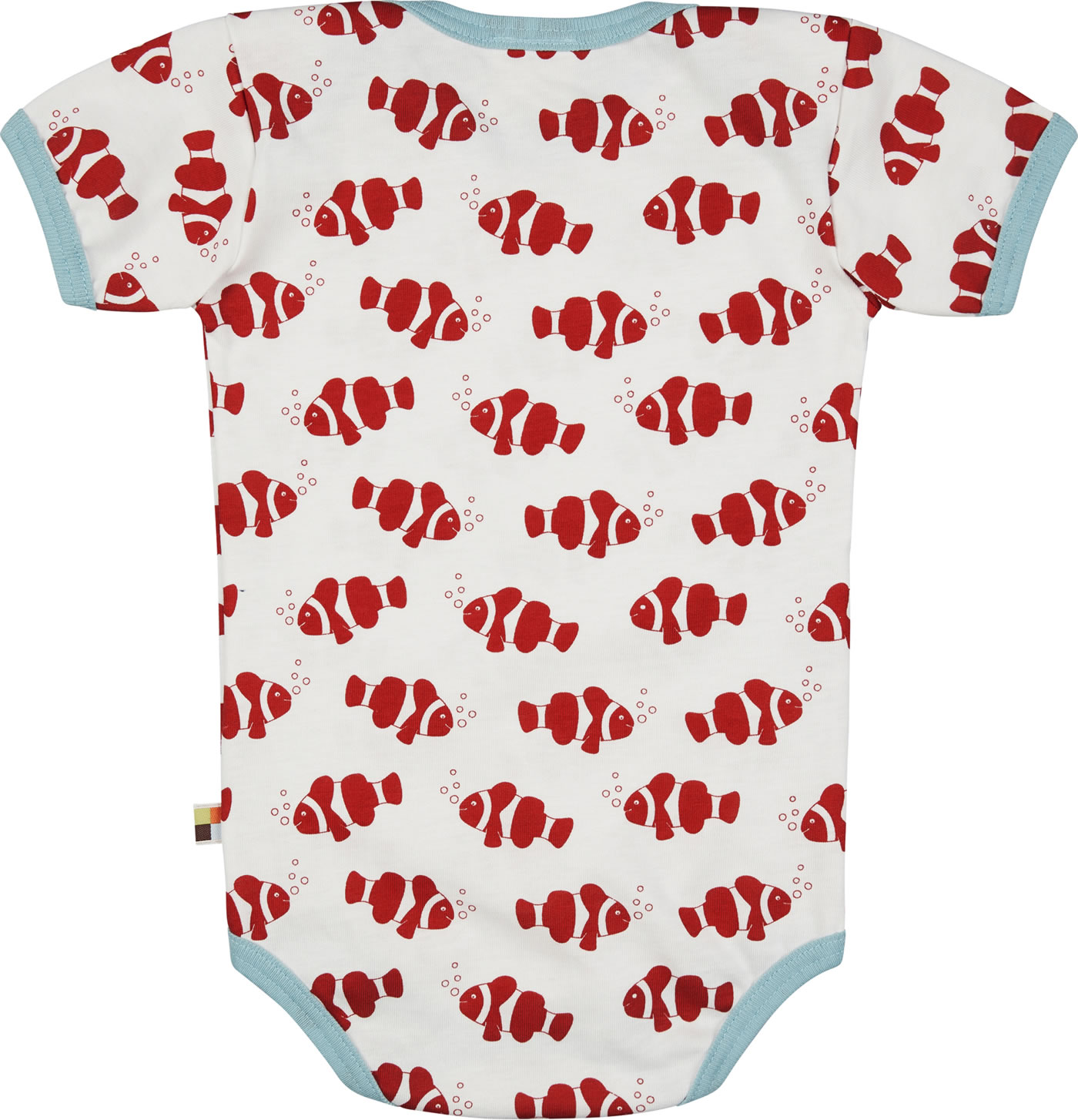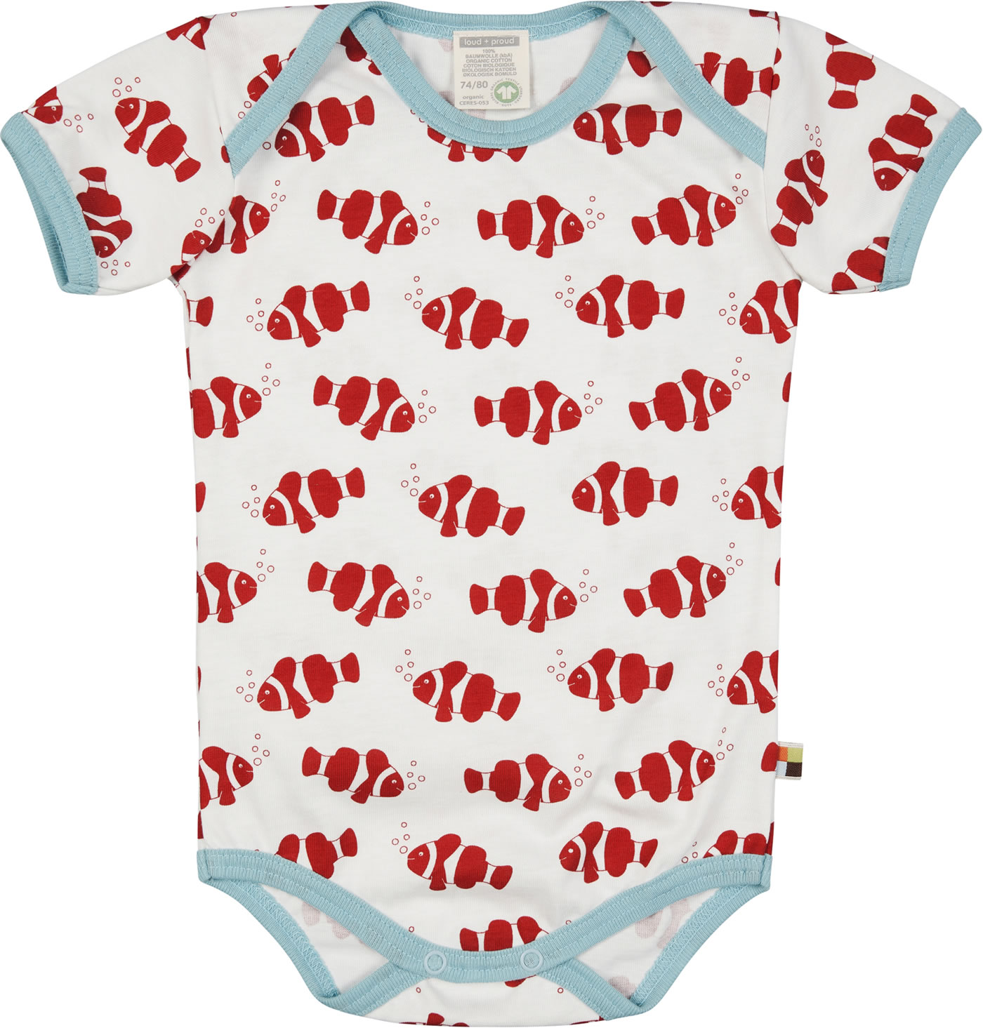 Toller Kurzarm-Body aus weichem Single Jersey mit ganzflächig aufgedruckten Fischen von LOUD+PROUD. Der Druck ist auf Wasserbasis gearbeitet und die Kanten sind mit Feinripp in einer Kontrastfarbe eingefasst. Der Body lässt sich im Schritt durch Druckknöpfe schließen und der Schlupfausschnitt erleichtert das An- und Ausziehen.
