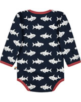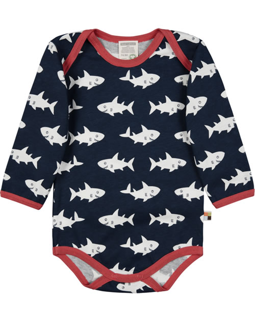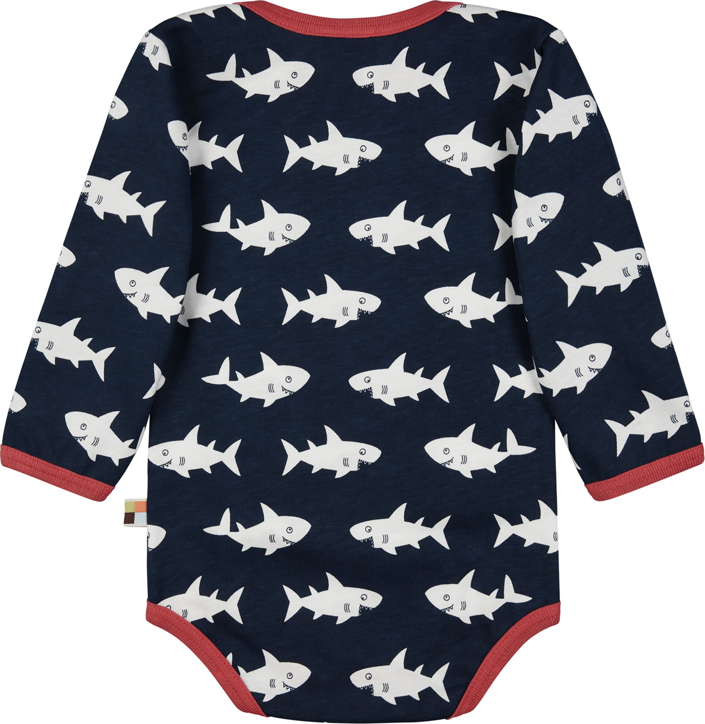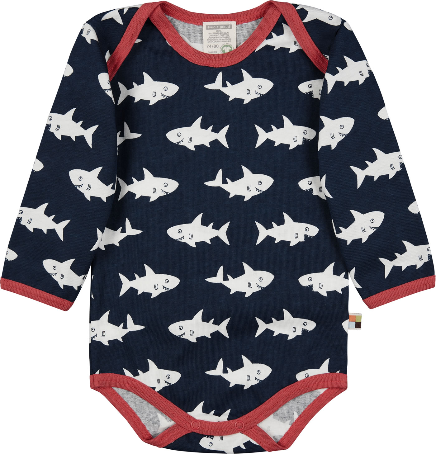 Toller Langarm-Body aus weichem Single Jersey mit ganzflächig aufgedruckten Haien ivon LOUD+PROUD. Der Druck ist auf Wasserbasis gearbeitet und die Kanten sind mit Feinripp in einer Kontrastfarbe eingefasst. Der Body lässt sich im Schritt durch Druckknöpfe schließen und der Schlupfausschnitt erleichtert das An- und Ausziehen.