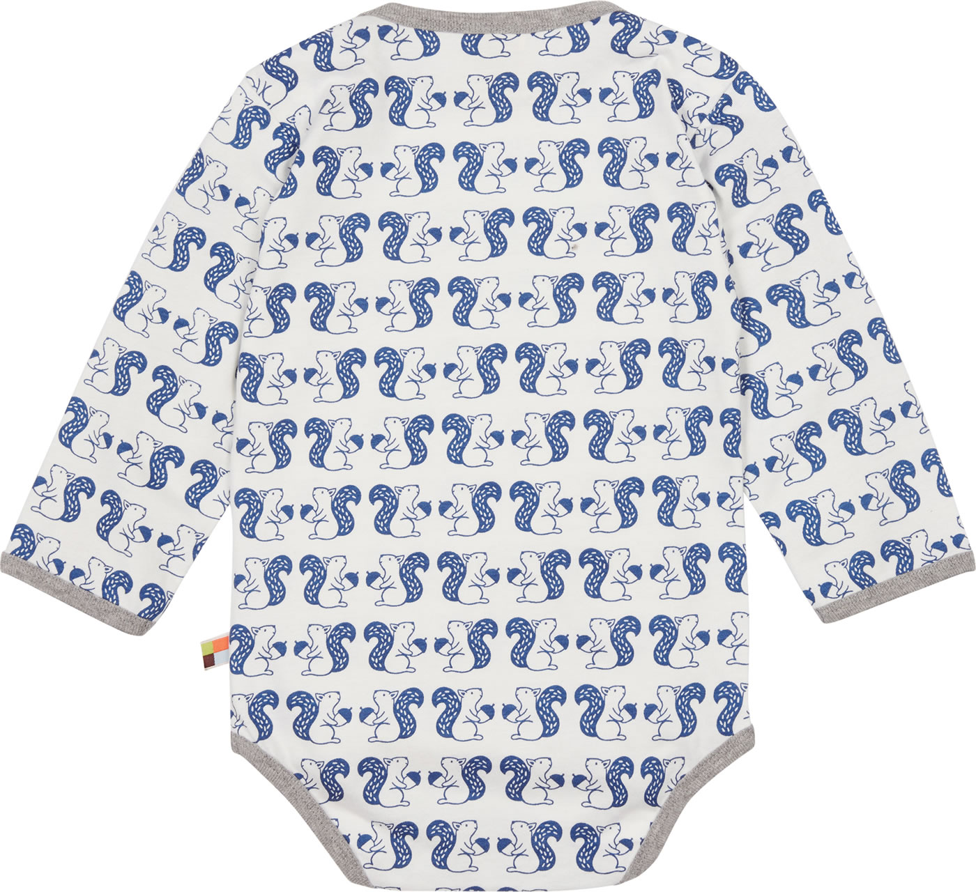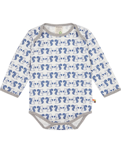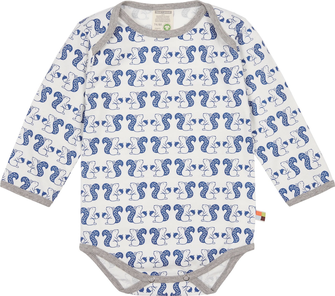 Schöner Langarm-Body aus weichem Single Jersey mit ganzflächig aufgedruckten Eichhörnchen-Motiven von LOUD+PROUD. Der Druck ist auf Wasserbasis gearbeitet und die Kanten sind mit Feinripp in der Kontrastfarbe grau eingefasst. Der Body lässt sich im Schritt mit Druckknöpfen schließen und der Schlupfausschnitt erleichtert das An- und Ausziehen.