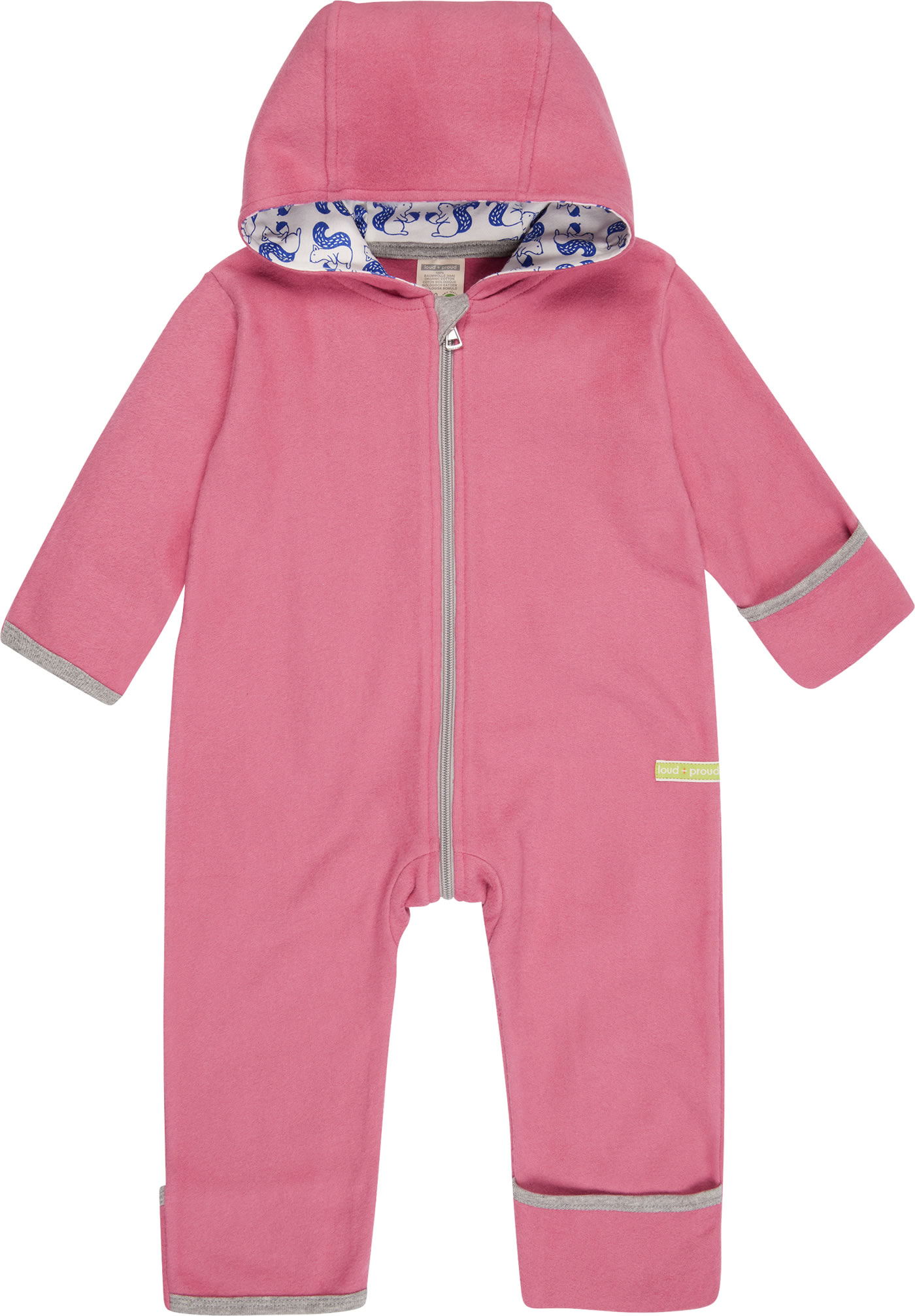 Kapuzen-Overall von LOUD + PROUD aus Baumwoll-Fleece. Der angeraute Baumwollstoff macht den Overall kuschelig weich und hält schön warm. Bündchen und Reißverschluss sind in Kontrastfarbe gearbeitet. Am Reißverschluss befindet sich ein zusätzlicher Kinnschutz. Das Innenfutter der Kapuze besitzt einen blauen Eichhörnchen-Print. Die Ärmel- und Fußenden können umgestülpt werden, so dass Hände und Füße schön warm bleiben. Somit ist der Overall auch ein ideales Kleidungsstück für die Babyschale oder den Kinderwagen.
