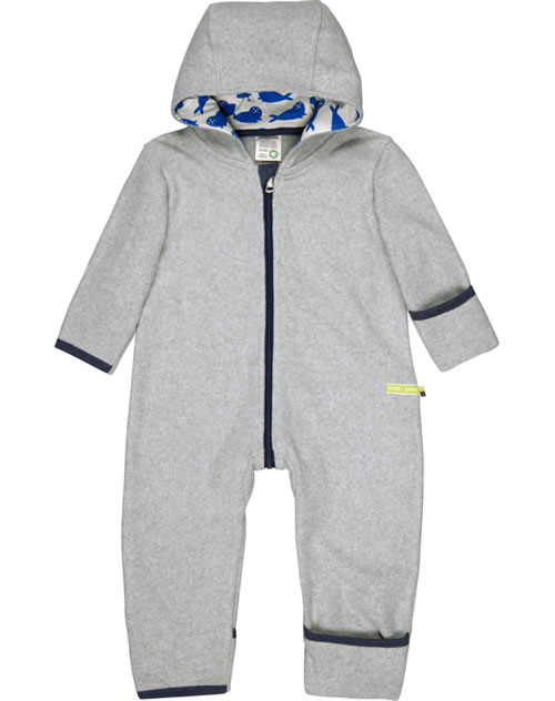 Kapuzen-Overall in grau von LOUD + PROUD aus Fleece. Der angeraute Baumwollstoff macht den Overall kuschelig weich und hält schön warm. Bündchen und Reißverschluss sind in der Kontrastfarbe dunkelblau gearbeitet. Am Reißverschluss befindet sich ein zusätzlicher Kinnschutz. Das Innenfutter der Kapuze besitzt einen blauen Robben-Alloverprint. Die Ärmel- und Fußenden können umgestülpt werden, so dass die Hände und Füße schön warm bleiben. Somit ist der Overall auch ein ideales Kleidungsstück für die Babyschale oder den Kinderwagen.