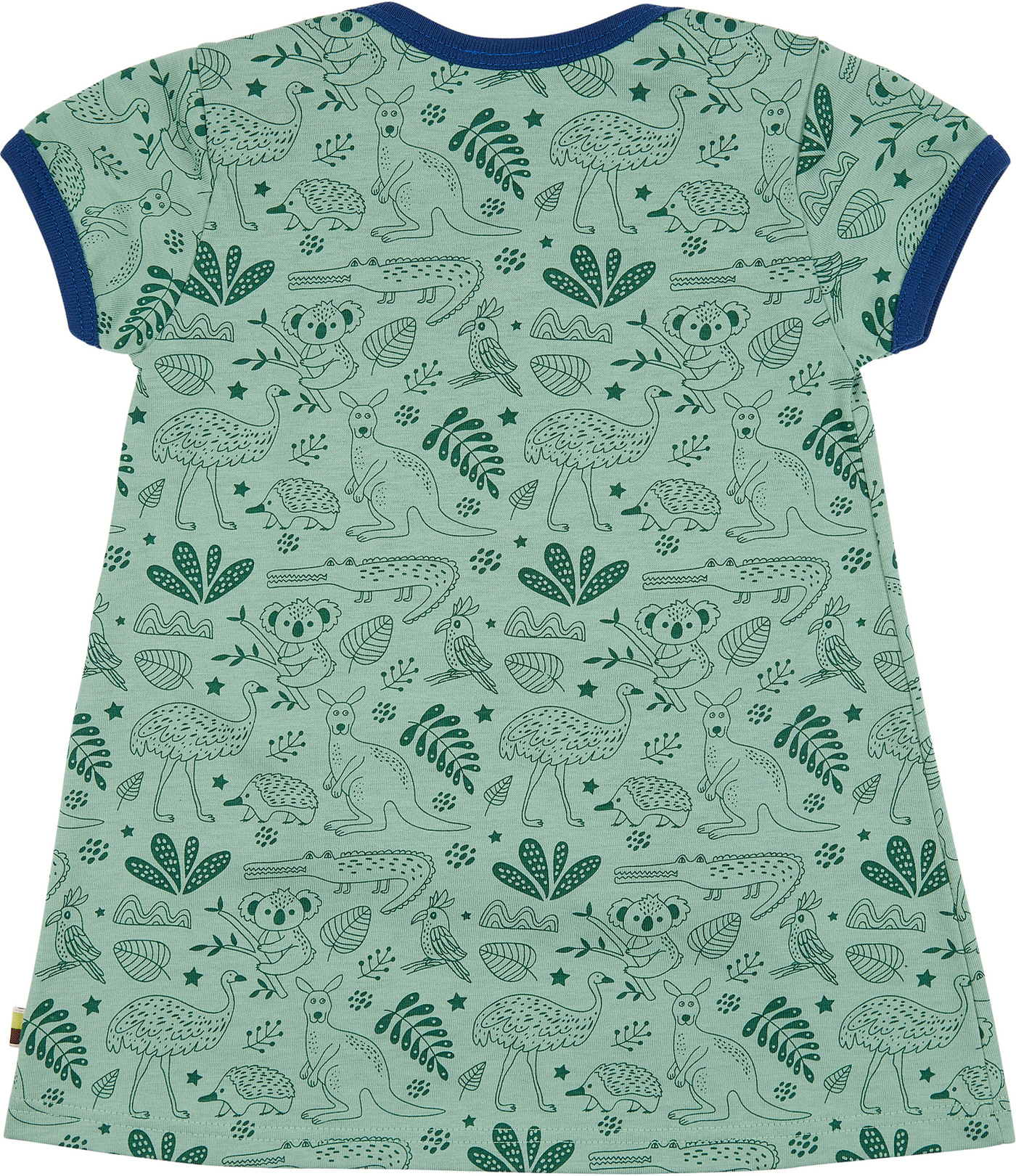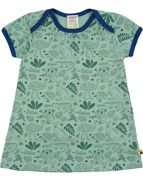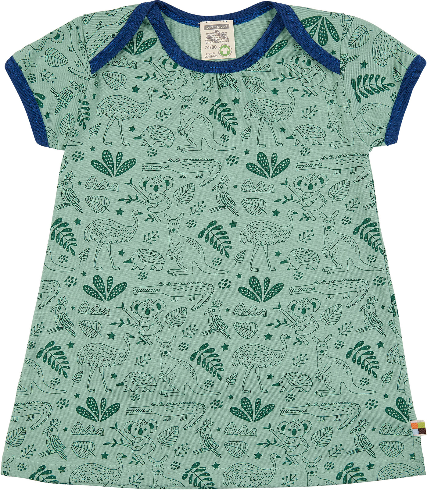 Hübsches Kurzarm-Kleid von LOUD + PROUD mit farbigen Paspeln. Das Kleid ist in leichter A-Linie geschnitten. Es lässt sich toll kombinieren: ob mit Strumpfhose oder solo getragen an warmen Tagen. Besonders schön ist der Print mit tollen Motven aus der Tierwelt Australiens.