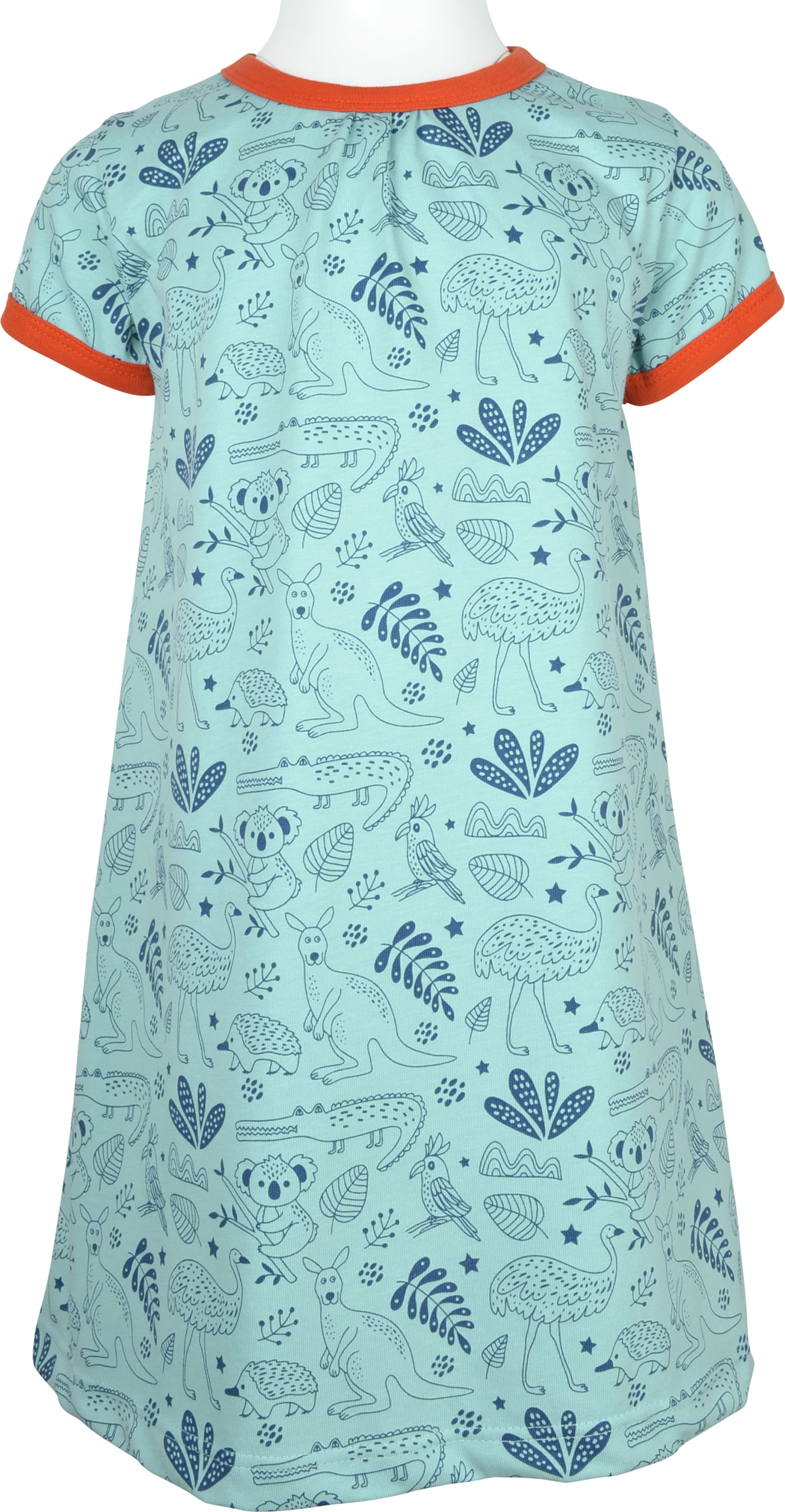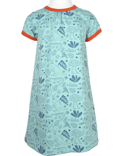 Hübsches Kurzarm-Kleid von LOUD + PROUD mit farbigen Paspeln. Das Kleid ist in leichter A-Linie geschnitten. Es lässt sich toll kombinieren: ob mit Strumpfhose oder solo getragen an warmen Tagen. Besonders schön ist der Print mit tollen Motven aus der Tierwelt Australiens.