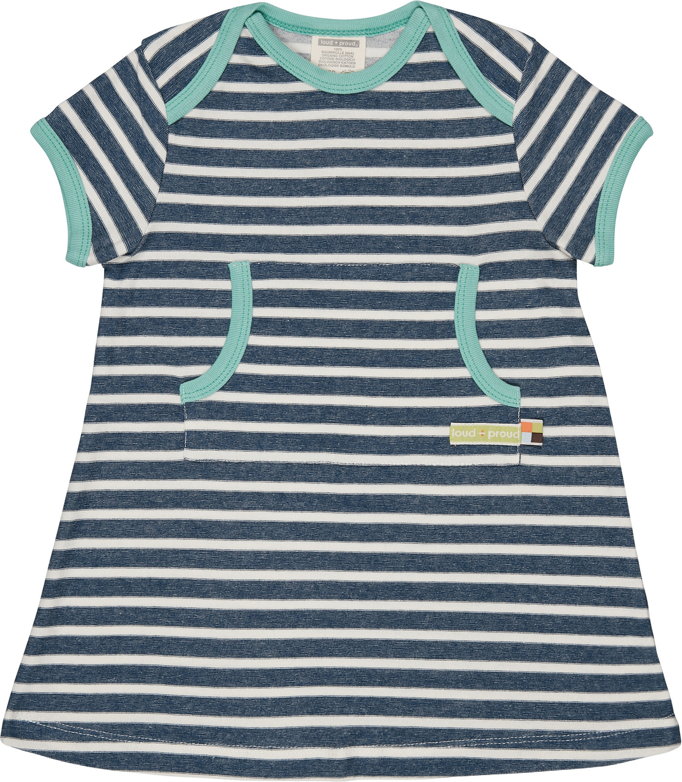 Schönes, gestreiftes Kurzarm-Kleid aus weichem Heavy Jersey mit geschmirgelter Oberfläche von LOUD+PROUD. Die Streifen und farbigen Paspeln sind ein hübscher Blickfang und machen das Kleid in diesem Sommer unverzichtbar. Eine Bauchtasche beitet Platz für Kleinigkeiten. Es lässt sich toll kombinieren: ob mit Strumpfhose oder solo getragen an warmen Tagen.