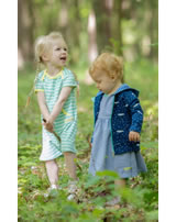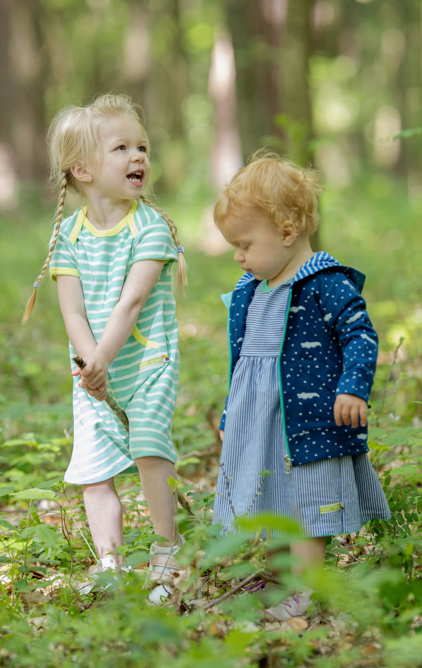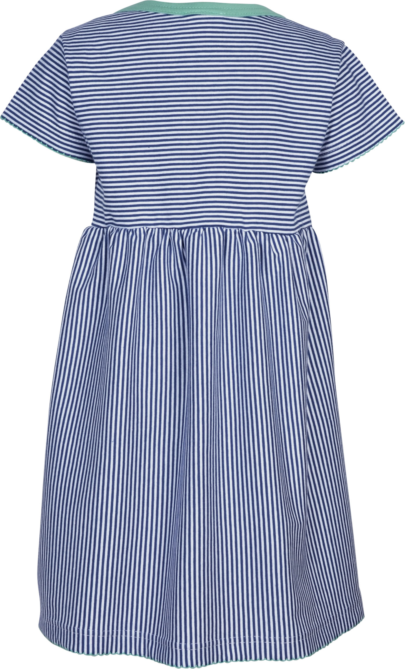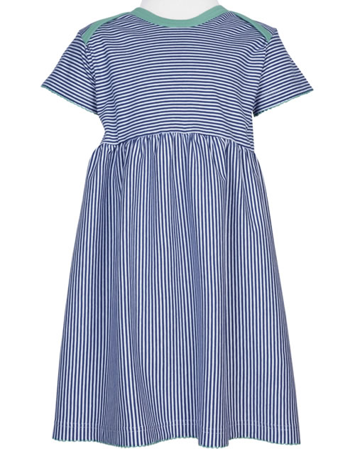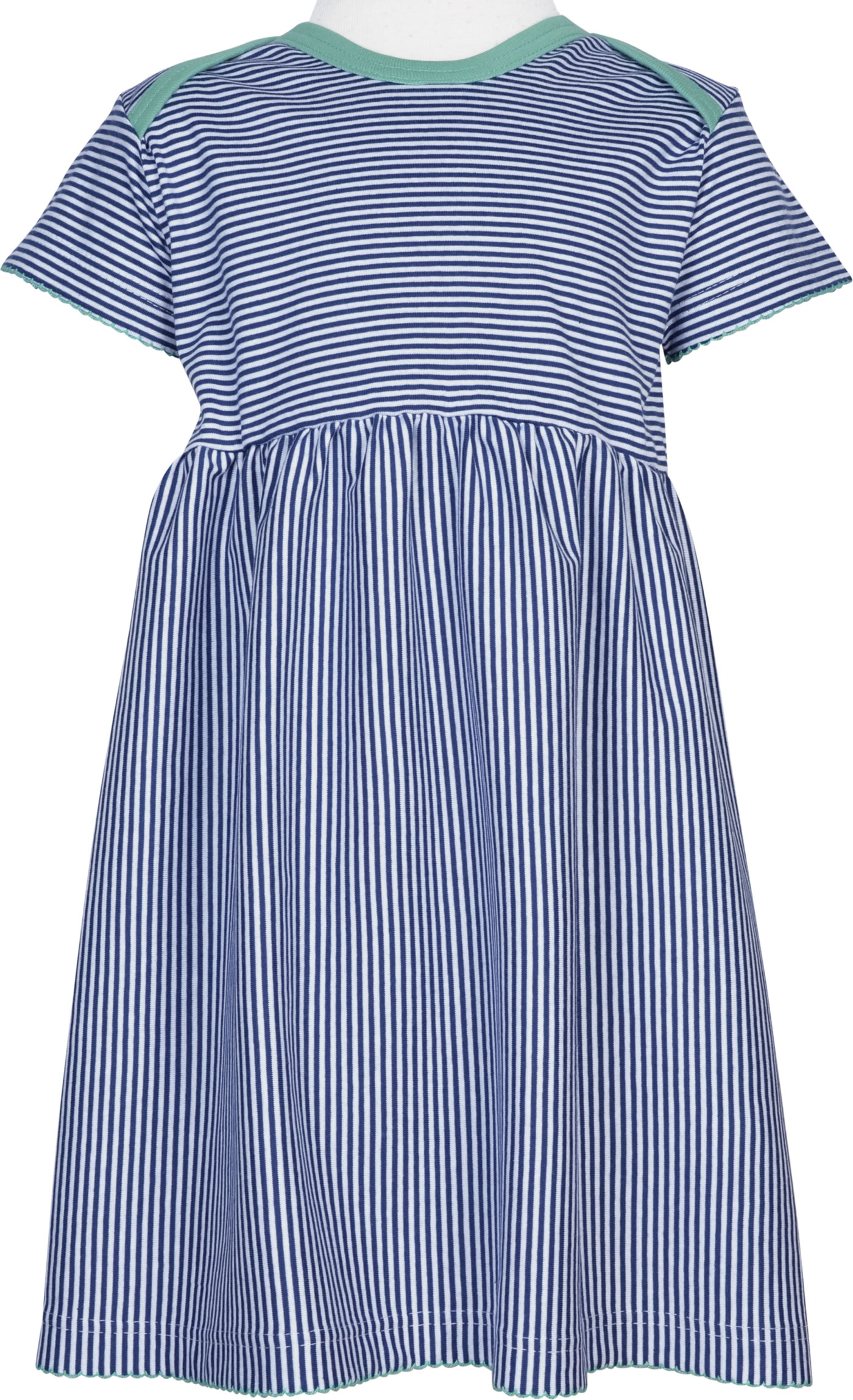 Niedliches Kurzarm-Kleid von LOUD + PROUD mit Streifen und farbigen Paspeln. Das Kleid ist in leichter A-Linie geschnitten. Es lässt sich toll kombinieren: ob mit Strumpfhose oder solo getragen an warmen Tagen. Das Gummibündchen in der Taille sorgt für einen perfekten Sitz. Ärmel und Saum schließen mit einer Picot-Kante ab. Bis Größe 86/92 mit Schlupfkragen.